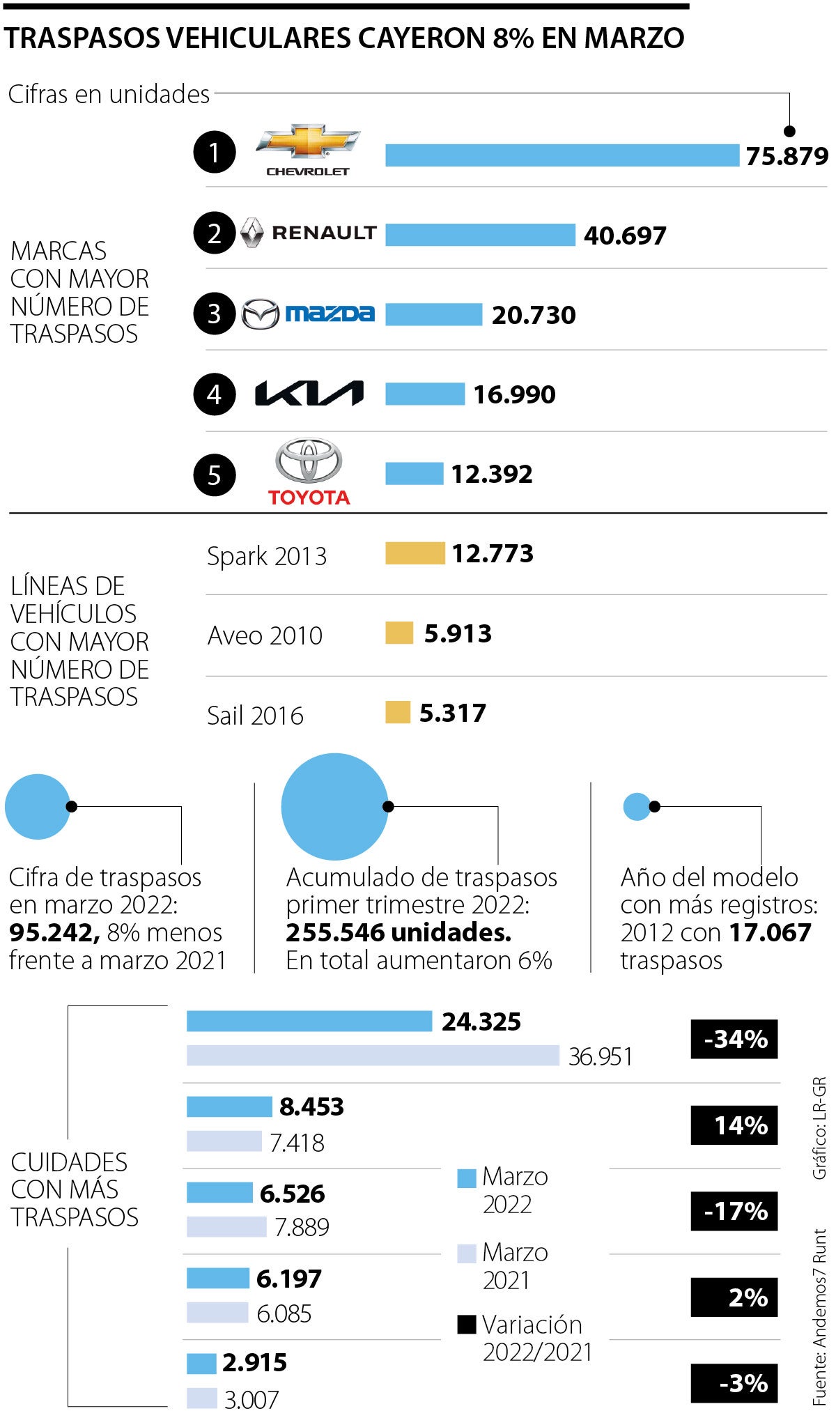 Sobre las líneas más comercializadas, el Spark 2013 continúa como el vehículo con más traspasos, con 12.773 unidades; seguido del Aveo modelo 2010, con 5.913, y el Sail 2016, con 5.317 registros. Y el año de modelo que más registros presentó es 2012, con 17.067 traspasos.