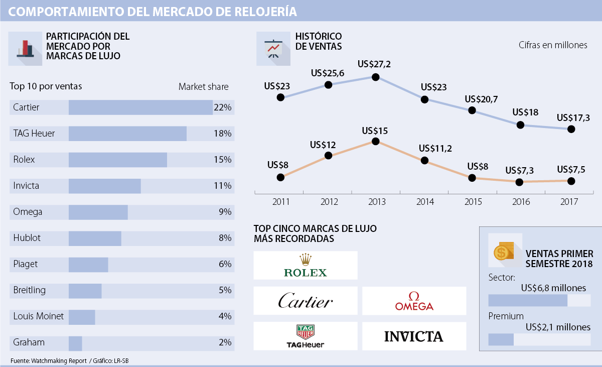 La relojería de lujo tuvo un mejor semestre que el mercado en general. El avance en ventas fue de 2,7%, pues entre enero y junio de 2017 la facturación de las marcas de gama alta llegó a US$7,3 millones y en los primeros seis meses de 2018 subió a US$7,5 millones. En la categoría de lujo, de las 10 principales marcas, las ventas (según market share) están en cabeza de Cartier, con 22%; luego TAG Heuer, con 18%; Rolex, con 15%; Invicta, con 11%; y Hublot, con 8%, en el quinto puesto. El mercado también se puede medir desde otra arista y es con el listado de las cinco marcas más recordadas. En ese ranking está Rolex en primer lugar, y siguen Cartier, TAG Heuer, Omega e Invicta.