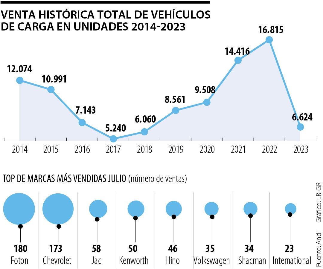Periódicamente, la Andi lleva un registro del volúmen en ventas y unidades del parque automotor de Colombia. Para julio, la Cámara reportó un decrecimiento de 29,2% respecto al mismo periodo de 2022 en ventas de vehículos de carga.