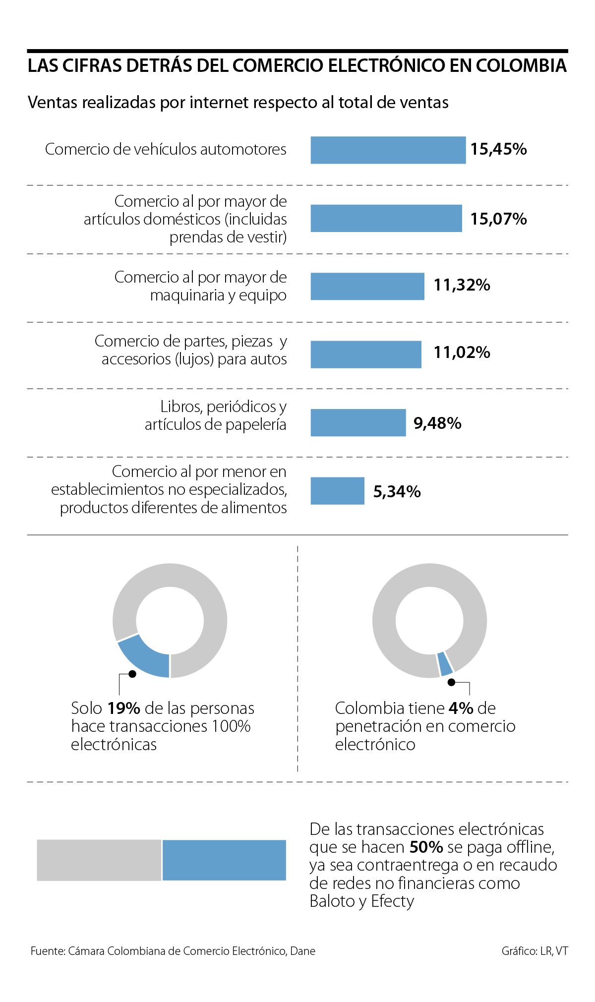 Asimismo, según una información del Departamento Administrativo Nacional de Estadística (Dane), lo que más se mueve por medio del comercio electrónico son los vehículos con una proporción de 15,45%, seguido por el comercio al por mayor de artículos y enseres domésticos, incluidas las prendas de vestir, que se llevan 15,07% del mercado.