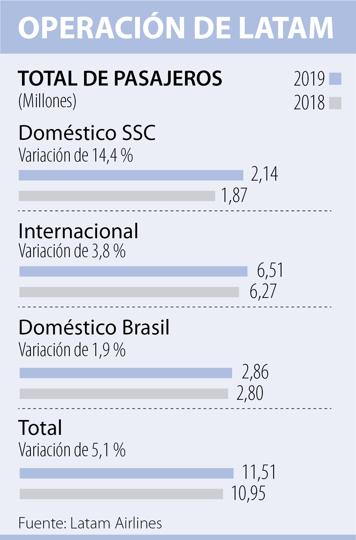 En la unidad de negocio de carga de Latam Airlines, las toneladas transportadas cayeron 3,3% en enero. La capacidad pasó de 553 millones de toneladas en el primer mes de 2018 a 545 millones en enero de 2019 bajando 1,4% y el factor de ocupación fue de 52,3% con disminución de 1,1 puntos porcentuales.
