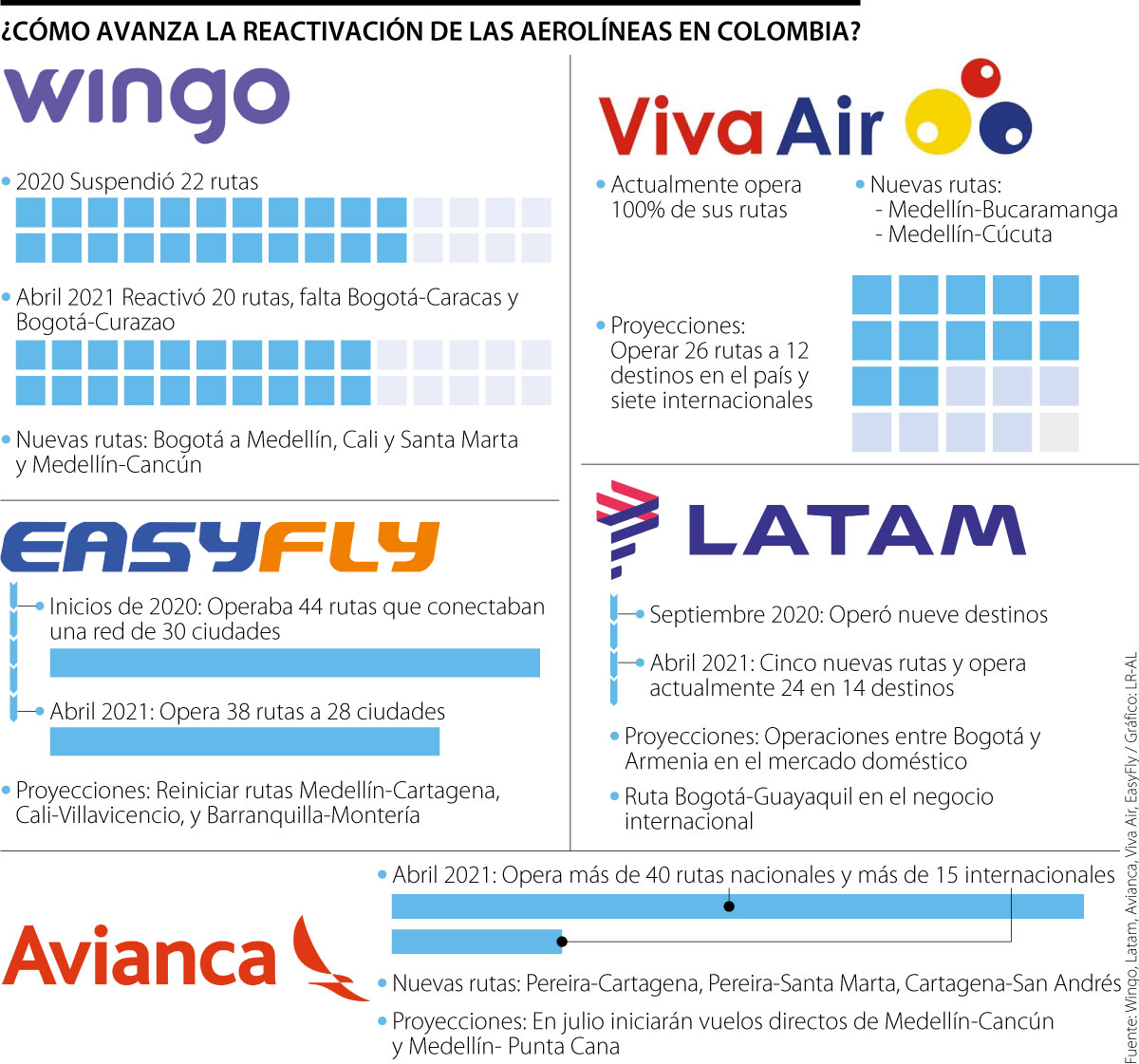Asimismo, Wingo, que tuvo que suspender sus 22 rutas por la pandemia, ya tiene activa toda su red a excepción de Bogotá-Caracas y Bogotá-Curazao.