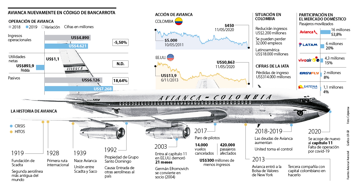 El Capítulo 11 del Código de Bancarrota de Estados Unidos al que decidió acogerse Avianca por segunda vez en su historia (la primera fue en 2003) es un proceso temporal que permitirá a la aerolínea reorganizar y completar su reestructuración financiera siempre y cuando esta se comprometa a mantener sus operaciones al día.