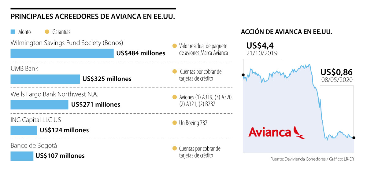 Entre los principales acreedores que tiene Avianca en EE.UU. se encuentran la compañía de servicios financieros Wilmington Savings Fund Society, por un monto de US$484 millones; UMB Bank, por US$325 millones, y cuya garantía son cuentas por cobrar de tarjetas de crédito, y Wells Fargo Bank Northwest N.A., que tiene un monto de acreencia por US$271 millones.