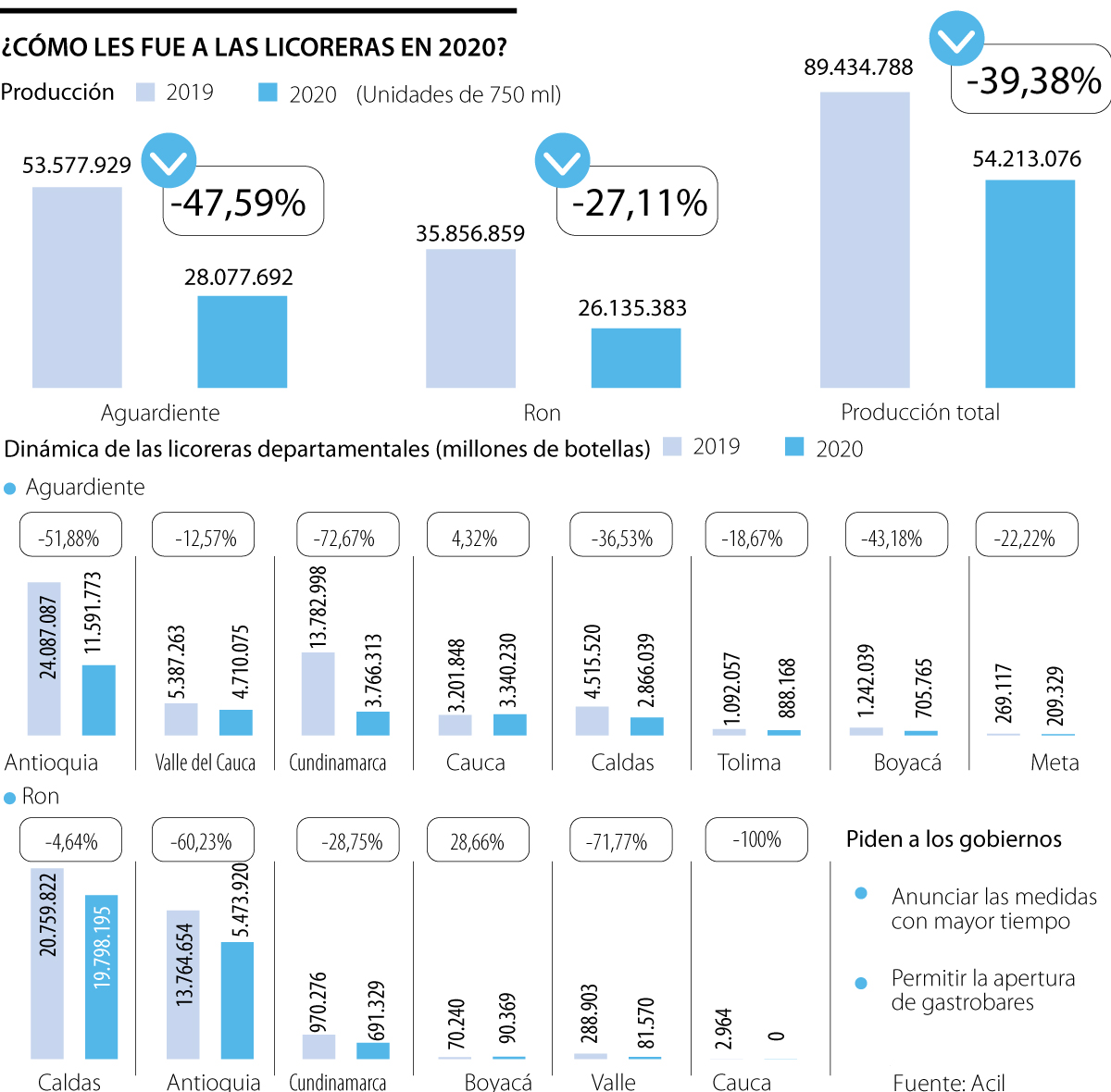 La industria licorera se vio afectada en 2020 debido a la cuarentena de seis meses, toques de queda y ley seca impuesta en varias ciudades. Muestra de ello es que fábricas departamentales comercializaron 54,2 millones de botellas, mientras que en 2019 fueron 89,4 millones, es decir, una caída de 39% y las de Cundinamarca y Antioquia fueron las más golpeadas.