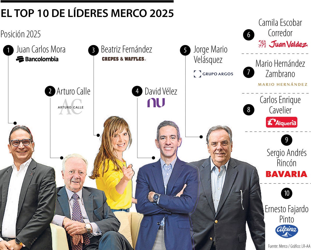 Arturo Calle Calle de Comercializadora Arturo Calle, pasa al 2º puesto; Beatriz Fernández de Crepes & Waffles, se mantiene en el 3º lugar; David Vélez, de Nubank, escala del 5º al 4º puesto; Jorge Mario Velásquez Jaramillo, del Grupo Argos, escala del 7º al 5º puesto; Camila Escobar Corredor, de Procafecol (Juan Valdez), asciende cuatro lugares pasando del puesto 10º al 6º lugar; Mario Hernández Zambrano, de Mario Hernández, pasa del 8º al 7º puesto; Carlos Enrique Cavelier Lozano, de Alquería, escala del puesto 11º al 8º lugar; Sergio Andrés Rincón Rincón, de Bavaria, escala cinco posiciones pasando del puesto 14º al 9º y Ernesto Fajardo Pinto, de Alpina, pasa del del 9º al 10º lugar.