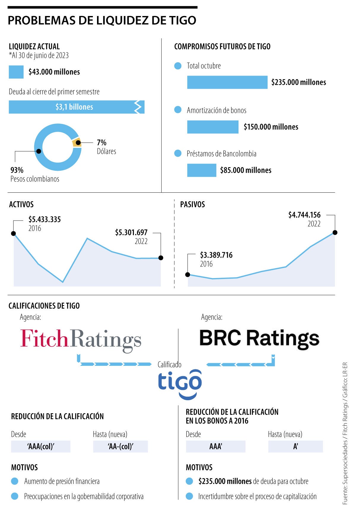 Ese tema de la liquidez de Tigo también fue un factor que tuvo en cuenta Fitch Ratings para bajar la calificación nacional de largo plazo de UNE EPM Telecomunicaciones S.A. (Tigo) a ‘AA-(col)’ desde ‘AAA(col)’ y armó la de corto plazo en ‘F1+(col)’.