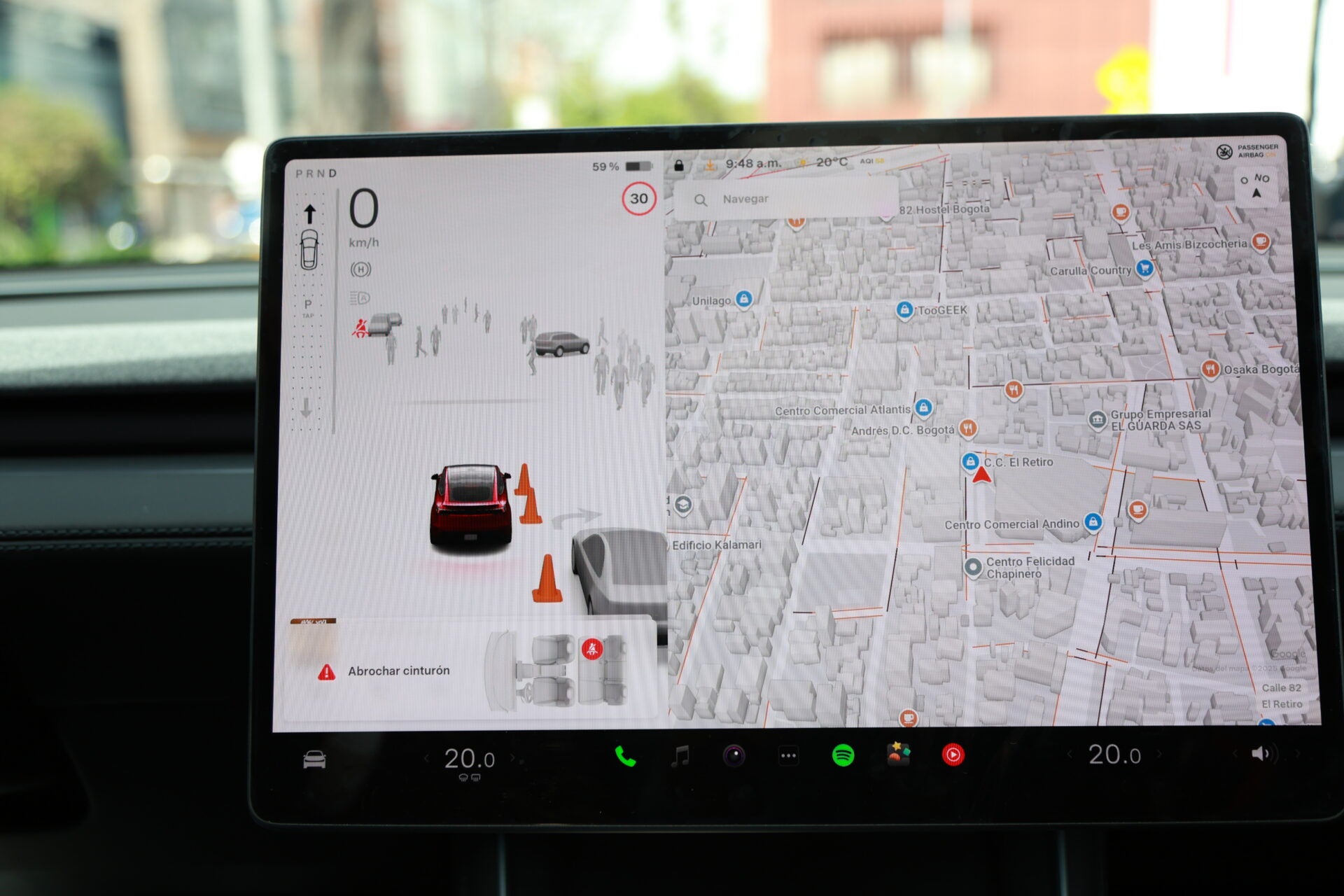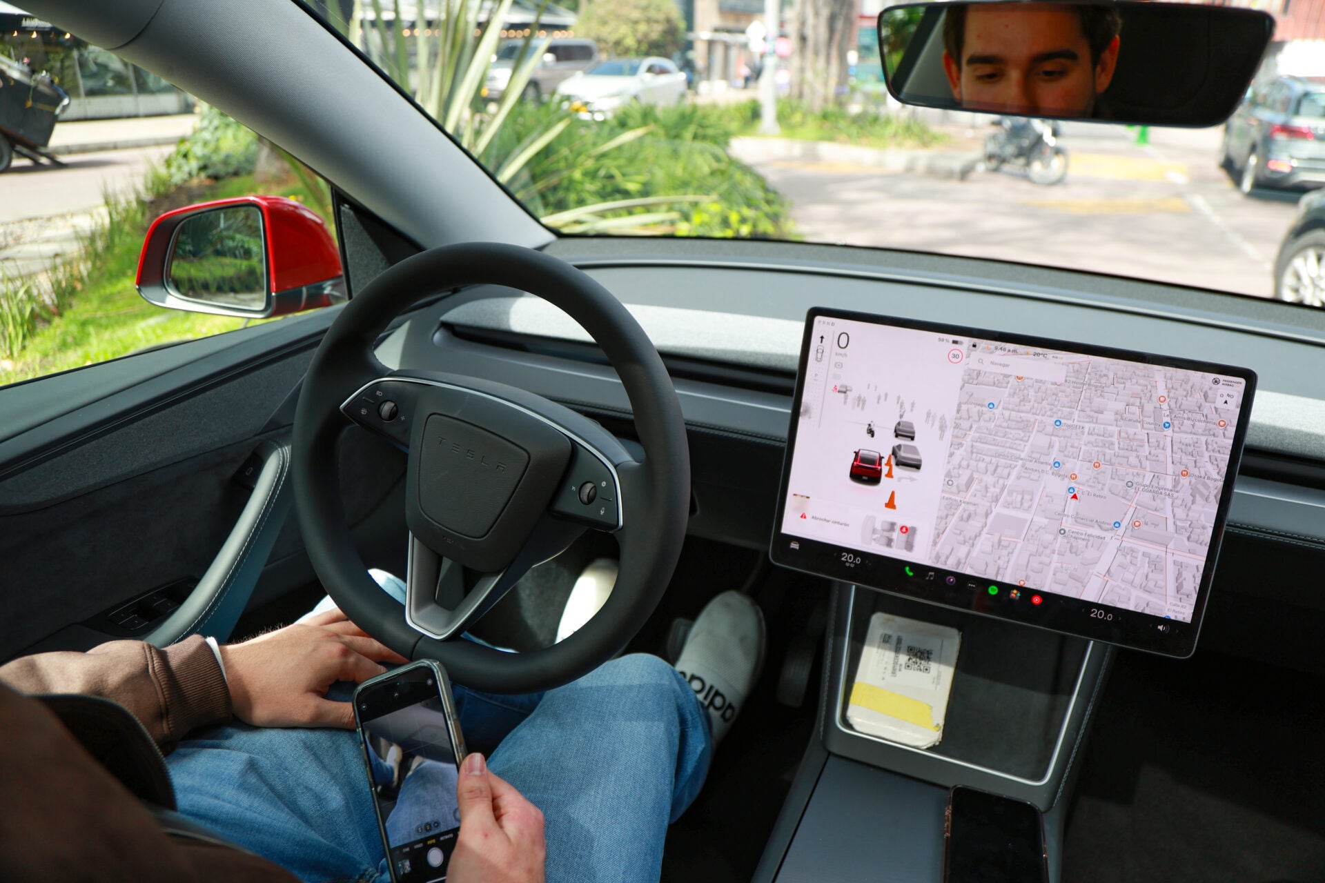 Al lado, en la otra zona, puede colocar su celular, que recibirá carga de manera inalámbrica. Para andar, debe tocar la pantalla en la esquina superior izquierda. Ahí está un dibujo de un carro en miniatura, con una flecha hacia adelante y otra hacia atrás. Esa es la caja de cambios. En la pantalla, para reversar, desliza el carrito para atrás y, en caso de avanzar, lo desliza hacia adelante. Una vez lo haga, puede soltar el freno, ya que el vehículo no se moverá hasta que presione el acelerador. A pesar de que la llegada de Tesla aún es incipiente en Colombia, la experiencia de conducción revela por qué la marca ha logrado diferenciarse en otros mercados. Su interior minimalista, gobernado casi por completo desde una pantalla, propone una interacción distinta a la de los vehículos tradicionales, donde funciones como el aire acondicionado, la música o los retrovisores.