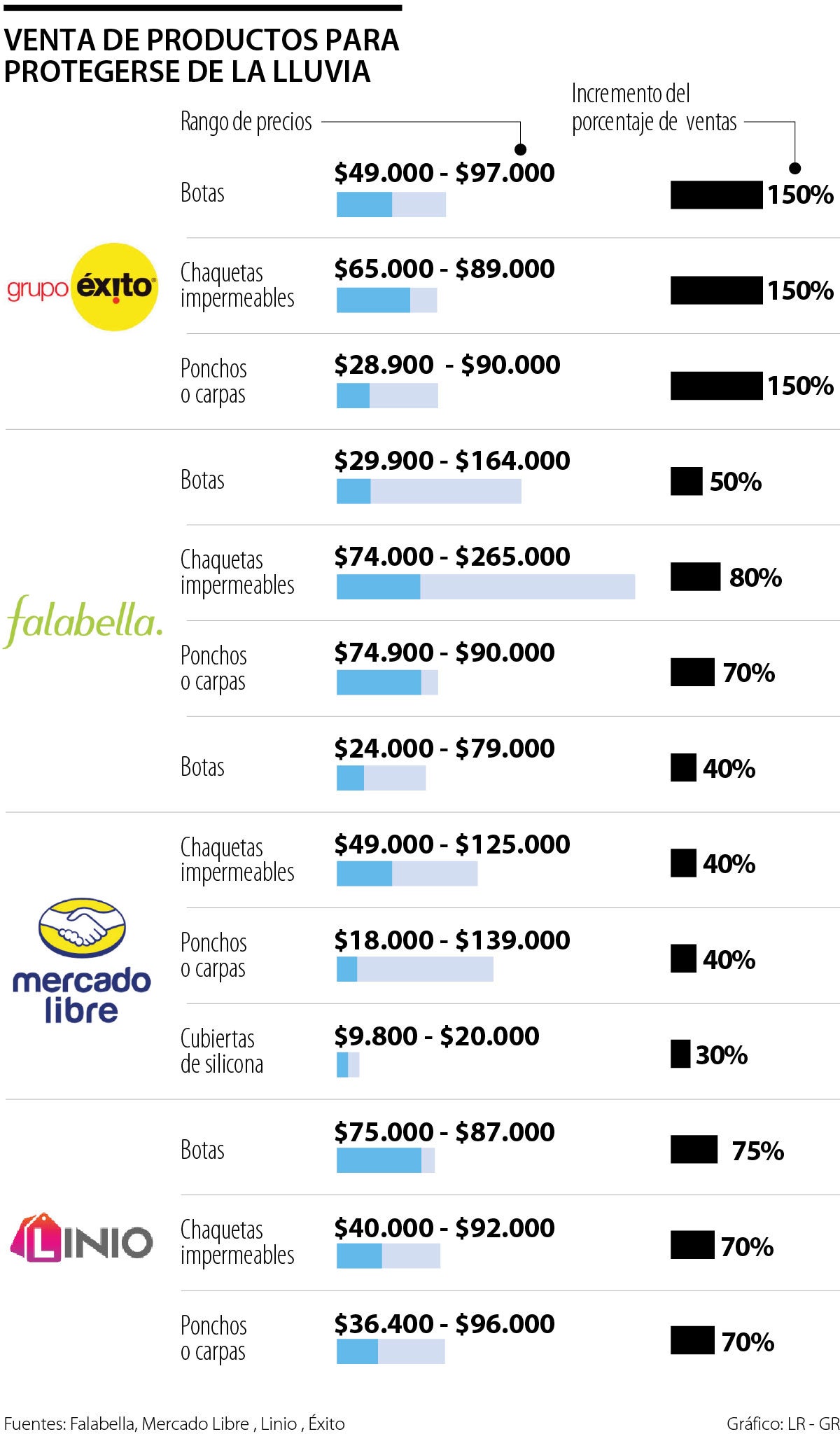 Éxito es el que reporta un incremento mayor a la media, con un alza en ventas de 150%. Representantes de Falabella señalaron que “hemos visto como la temporada de lluvias ha aumentado la tendencia de compra de algunos artículos, entre los que se destacan botas, chaquetas e impermeables”. Precisan, además, que es mayor en el caso de “las chaquetas masculinas, las cuales se vendieron más con respecto a mayo del año pasado”.