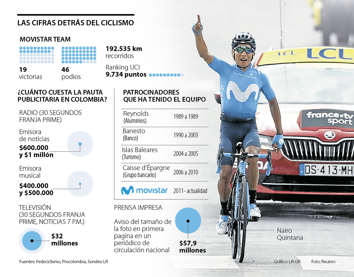 Esto lo ha convertido no solo en uno de los ciclistas mejores pagos, con US$2,2 millones al año, sino la ‘vaya publicitaria’ más vendedora del deporte, la cual ha sido explotada en los últimos años por la multinacional Movistar que tiene presencia en Colombia e invierte US$18,9 millones por temporada en el team.