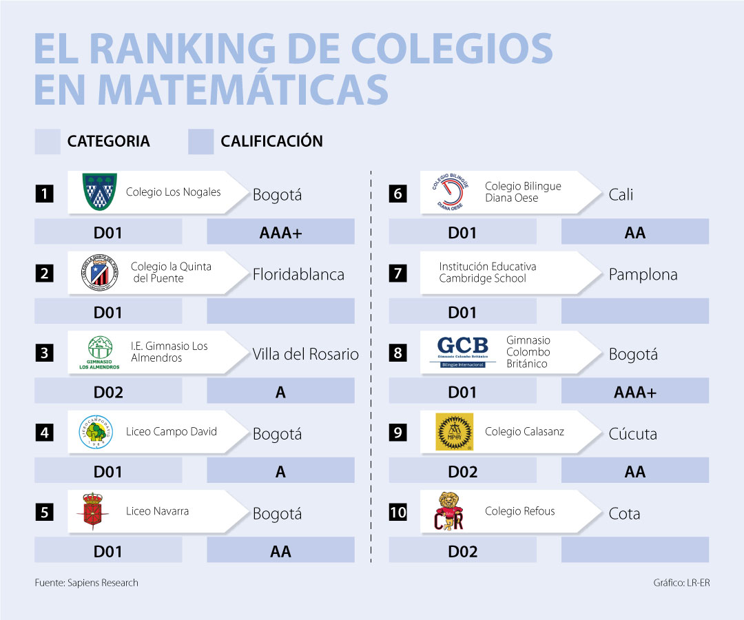 Si se toma el área de matemáticas, cuatro de los 10 primeros colegios son de Bogotá. El primero en la lista es el Colegio Los Nogales, que también es líder en el ranking general.