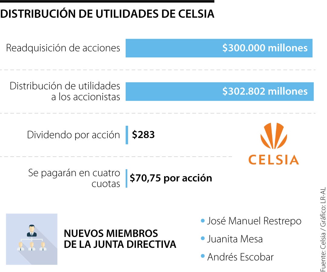 La empresa de energía del Grupo Argos, Celsia, llevó a cabo su Asamblea General este miércoles en la Plaza Mayor Medellín con la participación de más de 300 accionistas y una representación de 83% de las acciones en circulación. En la reunión se aprobaron propuestas como la distribución de utilidades a los accionistas por $302.802 millones, que equivalen a un dividendo por acción de $283; una donación para beneficio social por $5.974 millones y la elección de tres nuevos miembros de la junta directiva.