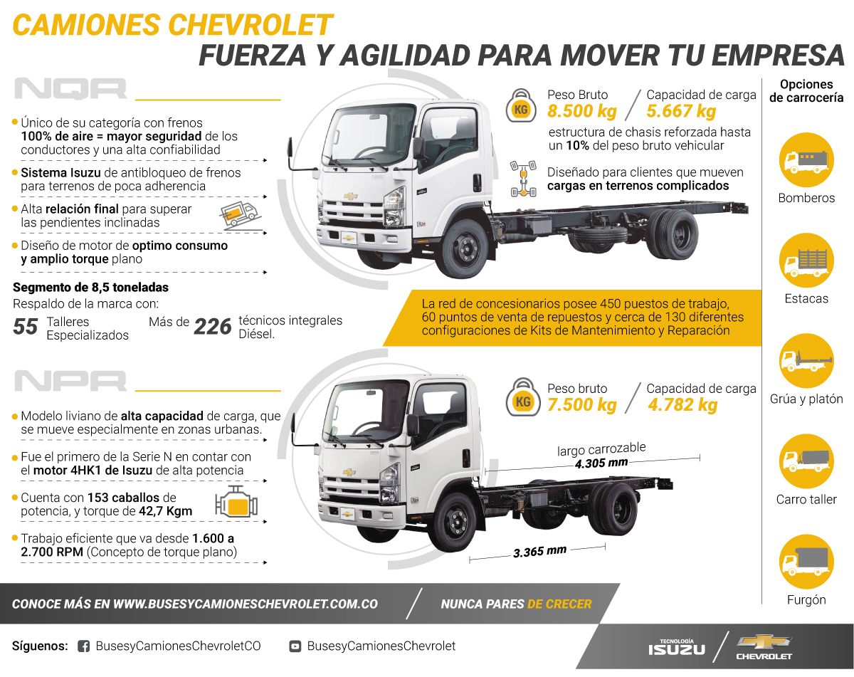 La compañía líder en el segmento de ventas de buses y camiones, Chevrolet, tiene en su oferta los camiones de referencia NPR y NQR los cuales se caracterizan por ser unos vehículos seguros y con buena capacidad de carga.