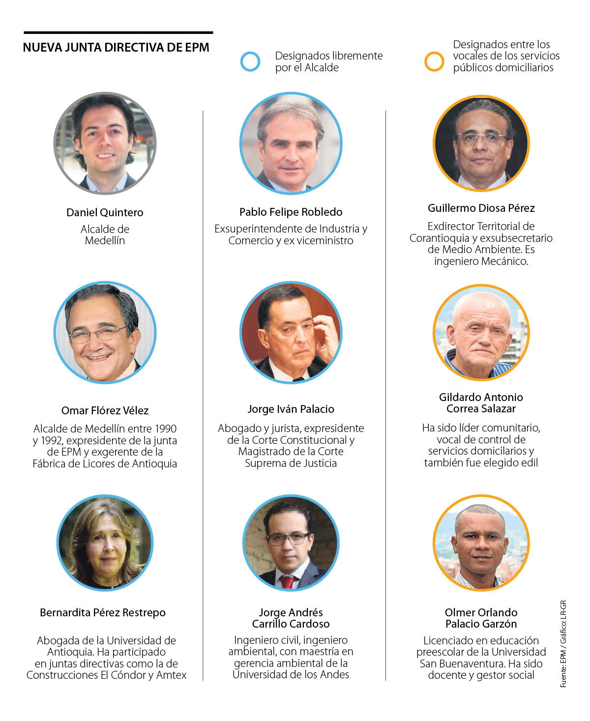 Los primeros en decir sí fueron el exsuperintendente de Industria y Comercio, Pablo Felipe Robledo; el expresidente de la Corte Constitucional, Jorge Iván Palacio y el exalcalde de Medellín, Omar Flórez, y a ellos se sumaron en el órgano directivo la abogada Bernardita Pérez y el consultor Jorge Andrés Carrillo. También fueron nombrados como vocales de control Guillermo Diosa, Gildardo Antonio Correa, y Olmer Orlando Palacio.