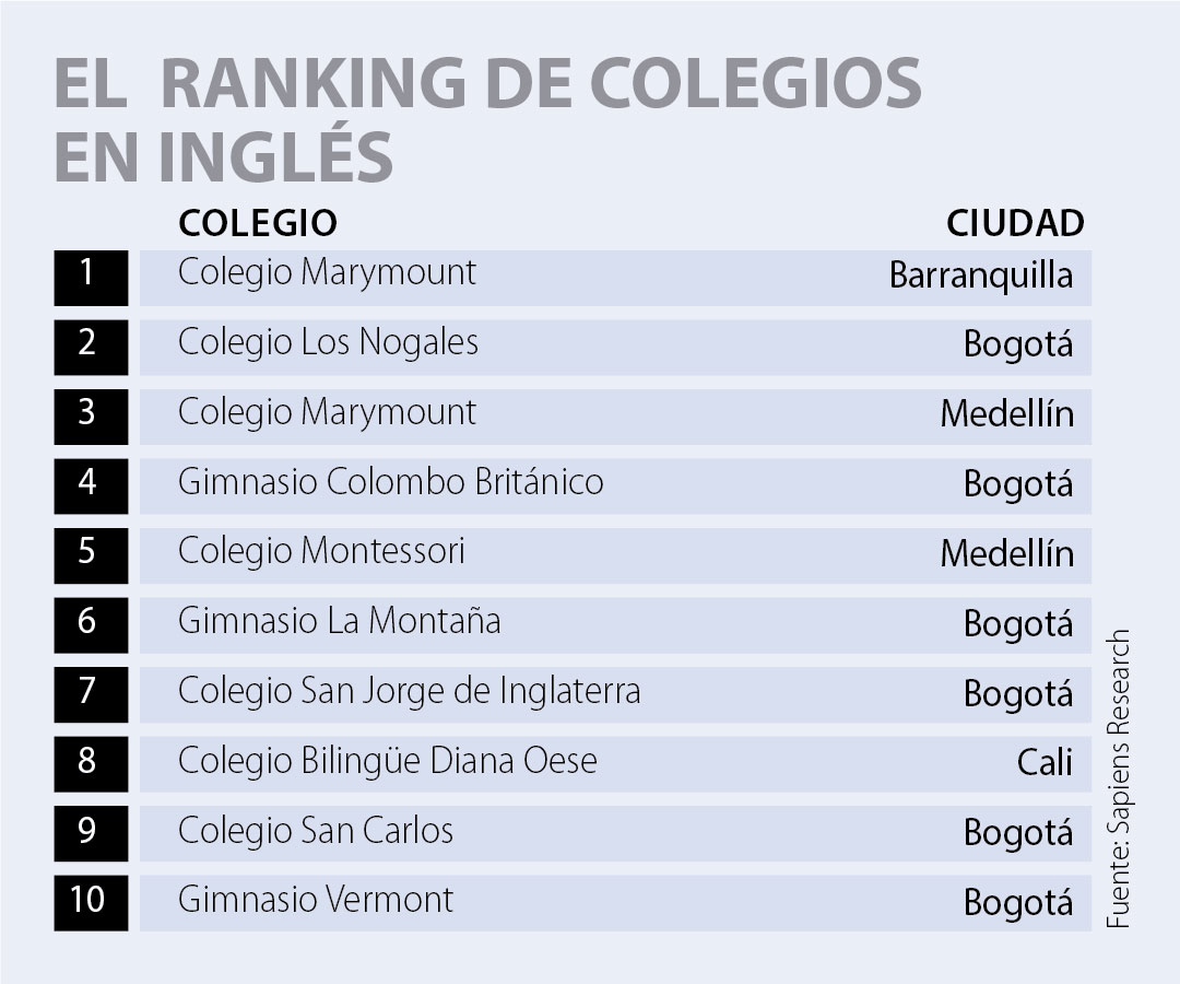Seis colegios están entre los 10 que tienen el mejor desempeño en inglés, de acuerdo con el último ranking Col-Sapiens, realizado por Sapiens Research. Sin embargo, el primer puesto se lo lleva una institución barranquillera: el Colegio Marymount, que en el ranking general ocupó la posición número 46.