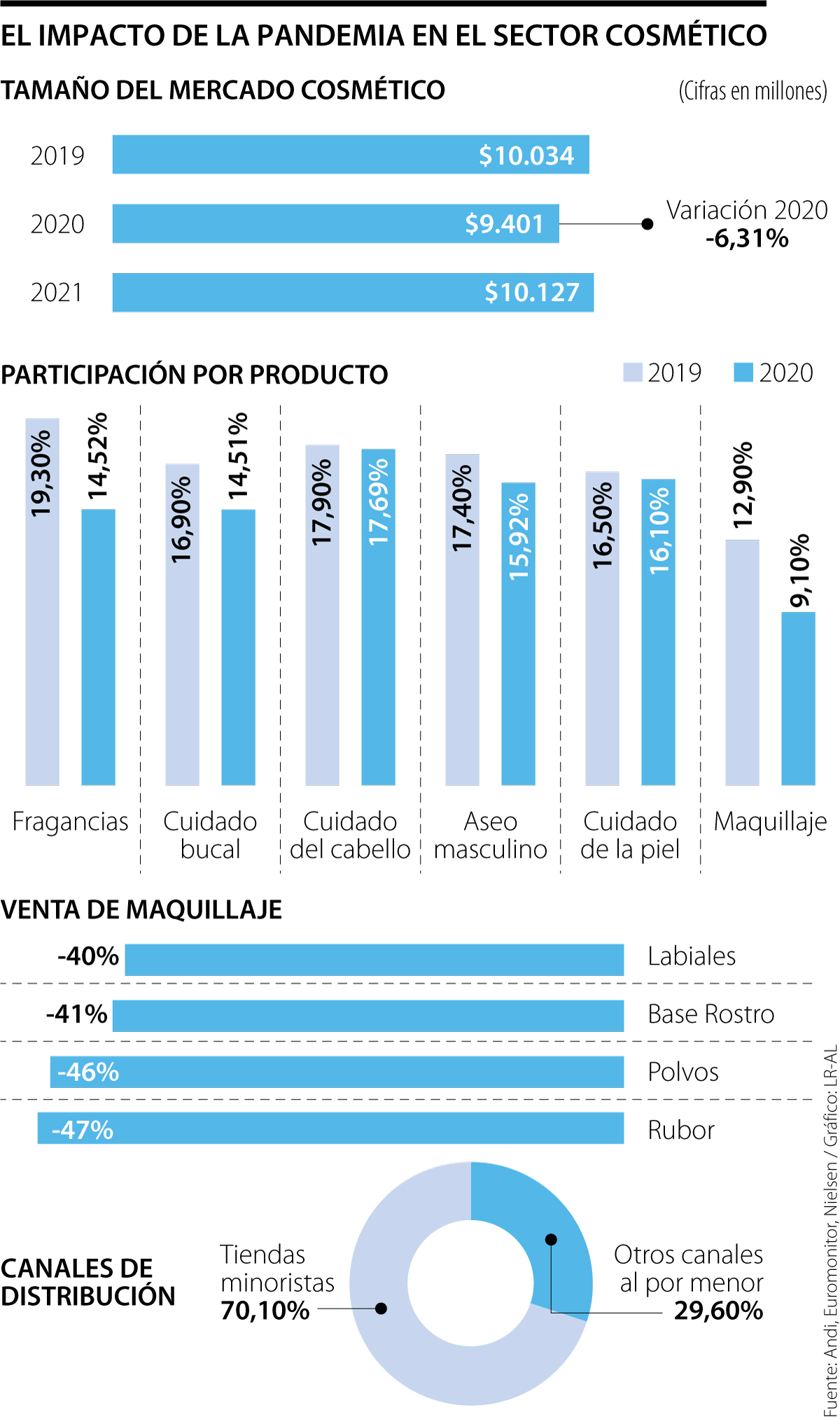 La pandemia, el teletrabajo y, sobre todo, el uso de tapabocas pusieron en jaque el sector cosmético en el país, pues el gasto per cápita anual pasó de casi $200.000 en estos productos a $179.000 durante 2020, lo que representó una caída de 9,75%.