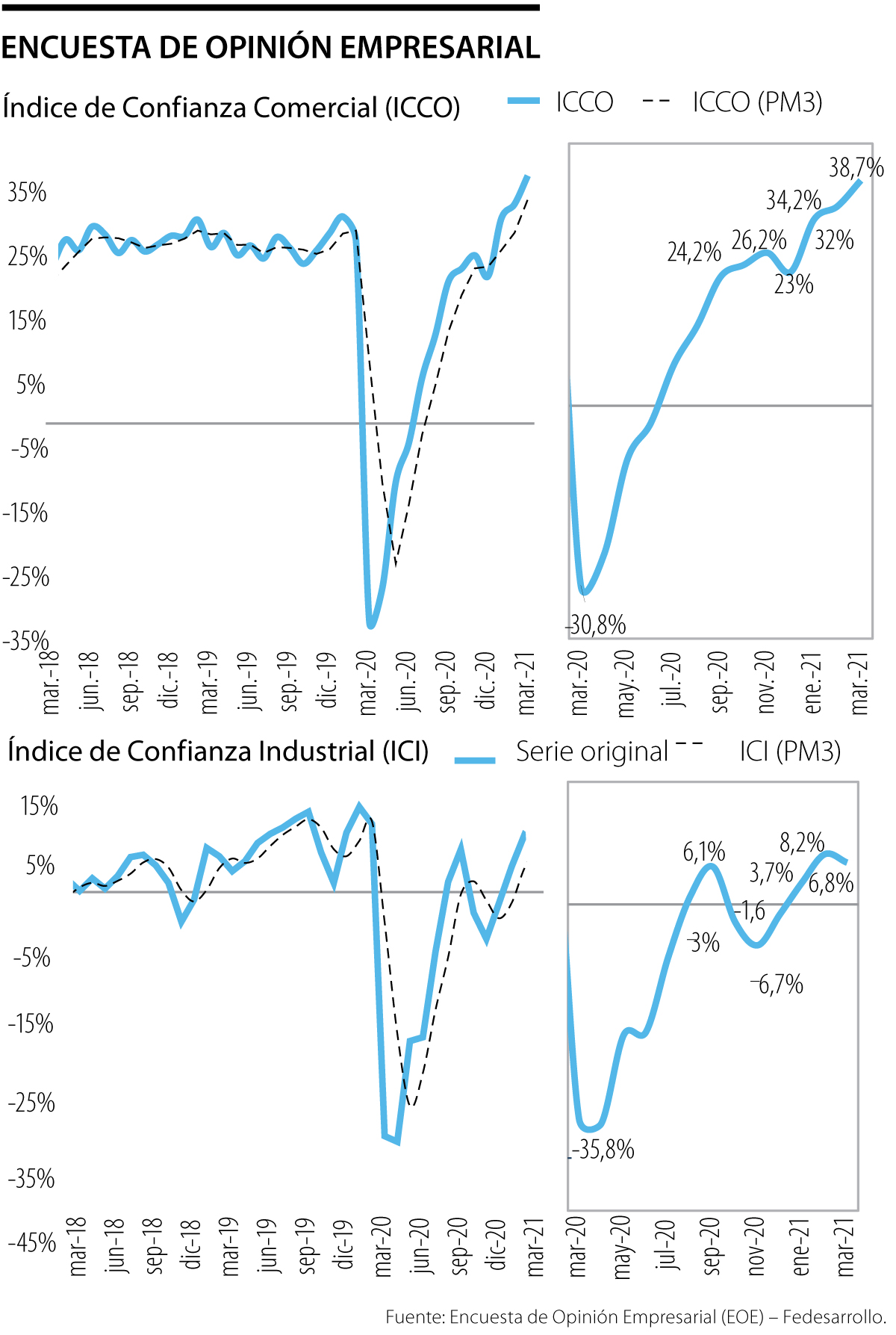 En marzo el Índice de Confianza Comercial subió hasta 38,7%, mientras que la Industrial se contrajo por expectativas de producción