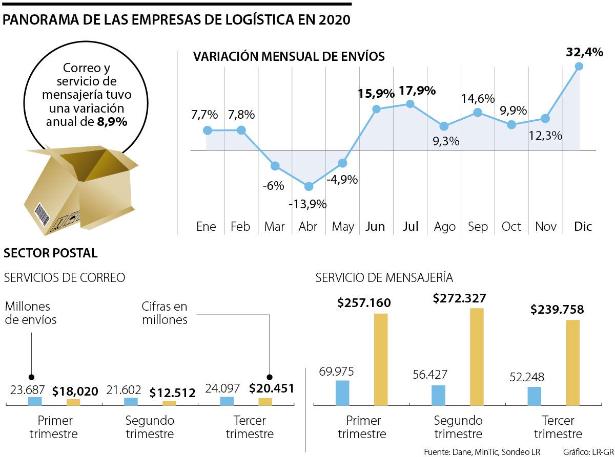 Si se hace el cálculo con base en $1,1 billones que movió el sector postal durante 2019, registrados por el Ministerio de las TIC, y se calcula con la variación que calcula el Dane para 2020, se estaría hablando de que el total de ingresos fue de $1,27 billones el año pasado.
