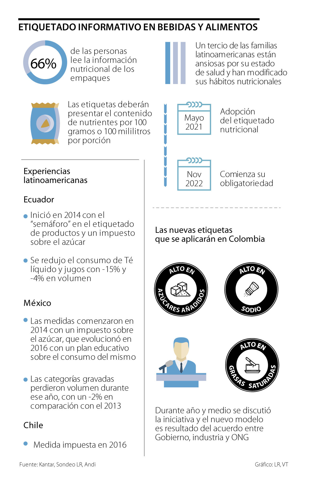 En el caso colombiano, es importante resaltar que no habrá un impuesto, por lo que los efectos en el consumo pueden ser aún más acotados que en los países antes citados. Lo que prevé el acuerdo anunciado en la Casa de Nariño es que en dos años, en la industria se usarán sellos negros, de forma circular y presentarán una advertencia sobre productos altos en azúcares añadidos, sodio y grasas saturadas. Adicionalmente, habrá un etiquetado positivo voluntario, para aquellos alimentos que cumplan con criterios benéficos para la salud.