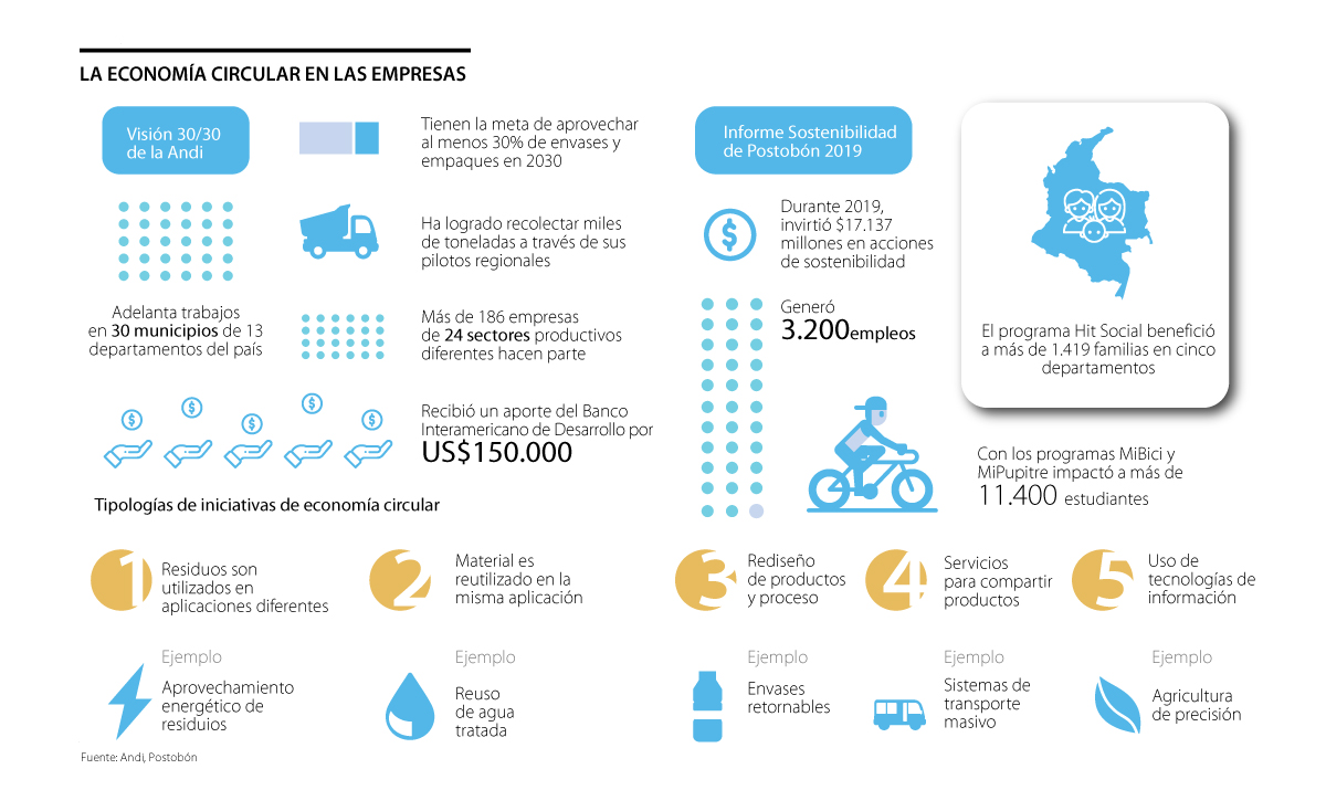 El presidente de Postobón, Miguel Escobar, expresó que los “empresarios estamos casados y convencidos de la economía circular”. Prueba de ello son las estrategias que tiene la empresa. Una de estas es programa MiPupitre Postobón, que integra prácticas sociales y ambientales al impactar sobre la educación y ayudar a la gestión posconsumo de un material reciclable como el de las cajas Tetra Pak. La empresa lo ha convertido en mobiliario escolar y a la fecha han entregado más de 33.000 piezas.