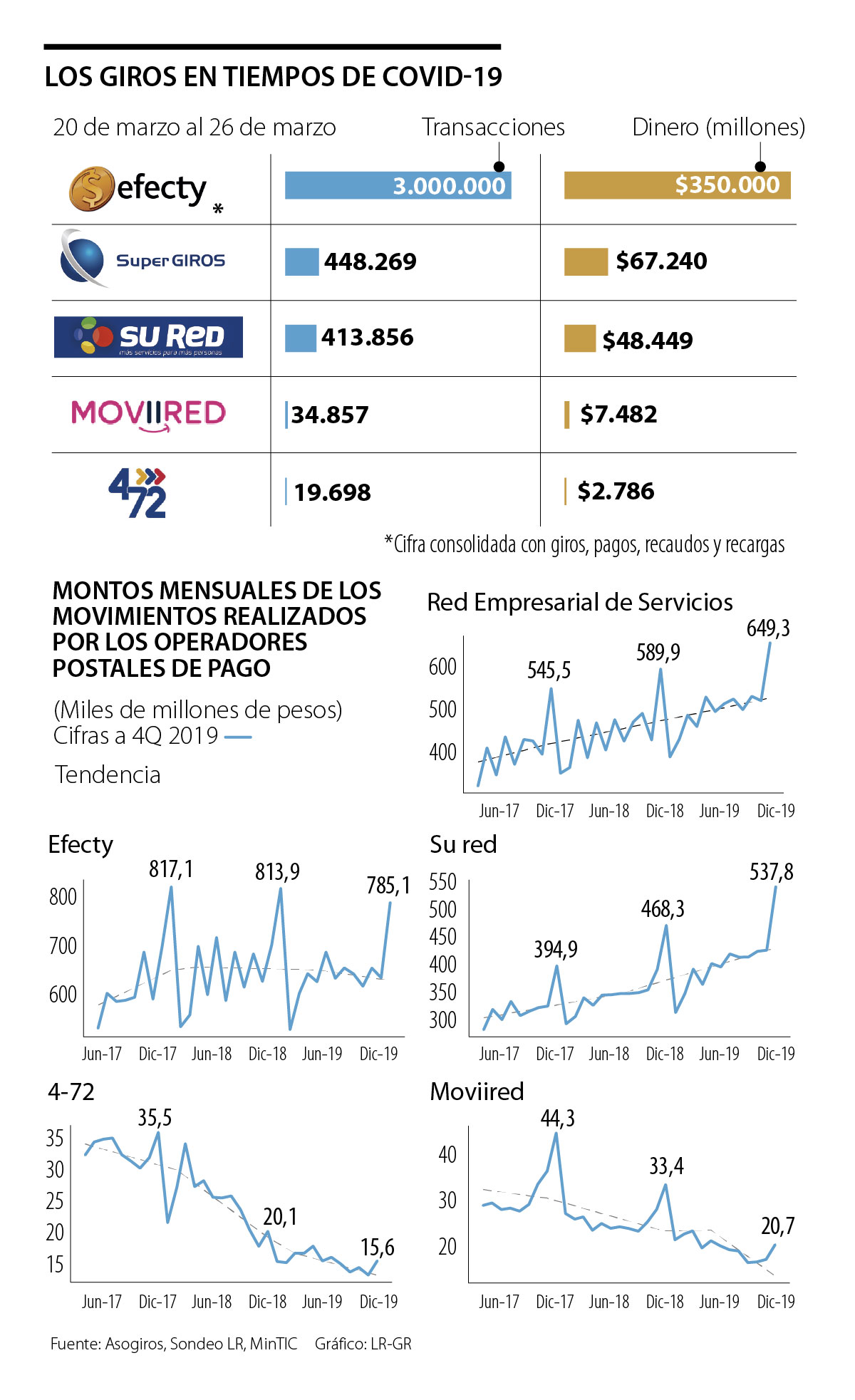 Durante esta coyuntura se han superado los $125.958 millones, solo en giros, entre Mobil red, 4-72, Supergiros, y Su red. Asimismo, Efecty, que siempre consolida la cifra con los resultados de giros, pagos, recaudos y recargas, movió más de $350.000 millones con cerca de 3 millones de operaciones.