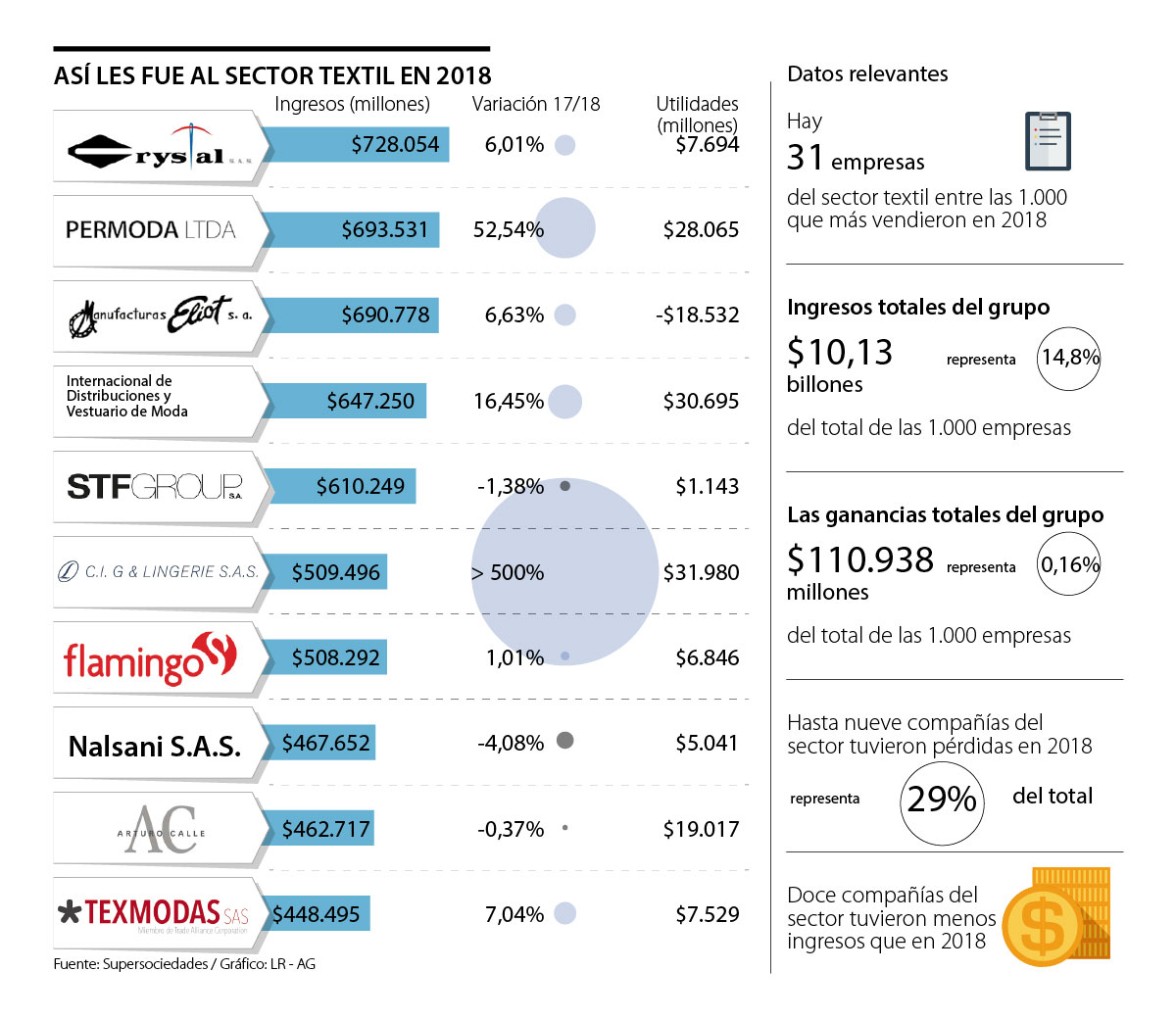 Este factor también se vio reflejado en las empresas de manera individual, pues de las 31 compañías textileras incluidas entre las 1.000 empresas más grandes del país, 12 tuvieron menos ingresos frente a 2017. Dicha cifra equivale a más de un tercio del sector.