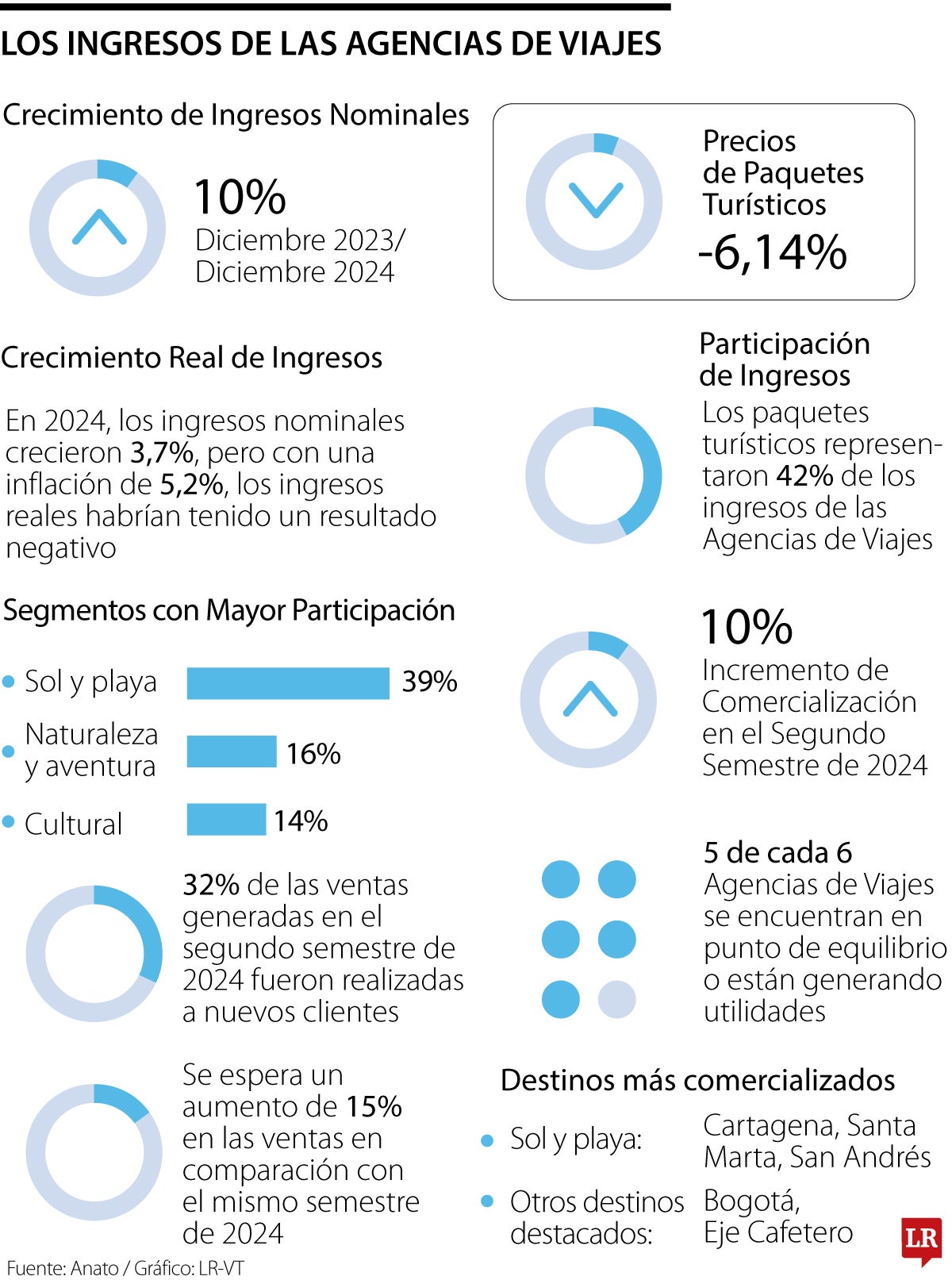 El año pasado, las agencias de viajes en Colombia registraron un crecimiento de sus ingresos nominales de 3,7% en comparación con 2023, según los datos revelados por la Asociación Nacional de Agencias de Viajes y Turismo, Anato. Sin embargo, es importante considerar que la inflación en el país durante el mismo periodo fue de 5,2%. Al deducir este factor, los ingresos reales del sector mostraron un resultado negativo, lo que resalta la presión económica que enfrentan las agencias.