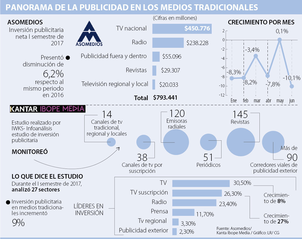 Según el estudio de inversión publicitaria neta presentado por Asomedios en julio de 2017 el total de inversión publicitaria durante el segundo trimestre de 2017 disminuyó 6,2%; en radio presentó un crecimiento de 4,06%; en revistas -15,9%; en televisión local y regional -9,7%, nacional -9,5%, y en total -9,5% y finalmente en inversión publicitaria fuera de casa también presentó cifras en rojo de 9,9%. Respecto a la inversión publicitaria que se dio mes a mes durante este periodo en enero la cifra fue negativa con 8,3%; febrero -8,2%; marzo -3,4%; abril -7,8%; mayo 0,1% y junio -10,1%.