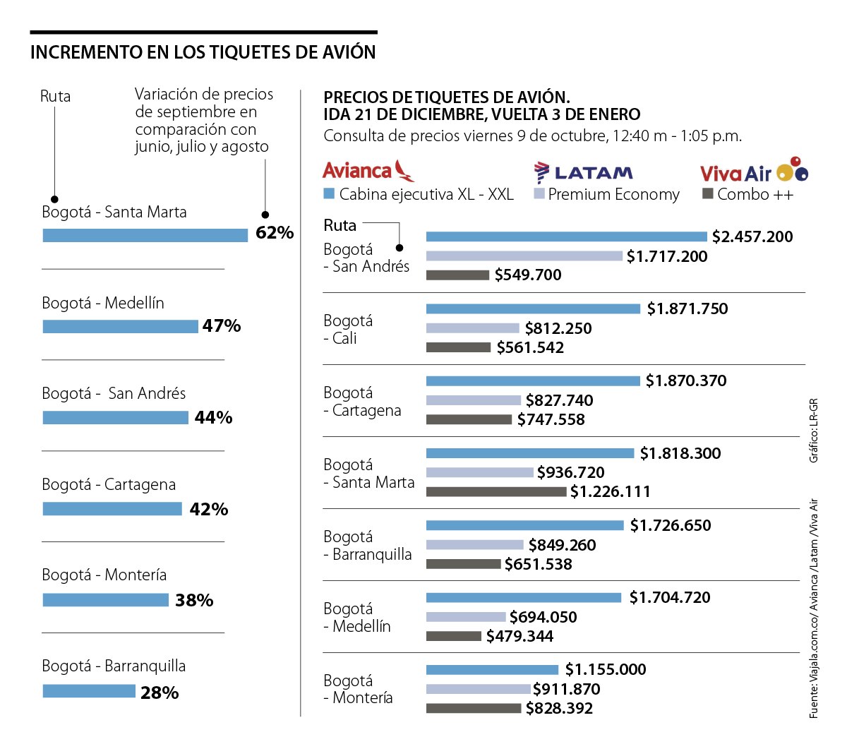 El incremento más fuerte, de acuerdo con un análisis del portal Viajala, es la ruta Bogotá - Santa Marta, con un aumento de 62% frente a los precios que había en junio, julio y agosto. El segundo destino más afectado es Medellín, adonde los tiquetes ya han subido 47%, y el podio lo cierra el vuelo entre Bogotá-San Andrés, que ha visto incrementos de 44% en los precios. Según el análisis de Viajala, los únicos destinos que han subido menos de 40% son Bogotá-Montería (38%) y Bogotá-Barranquilla (28%).