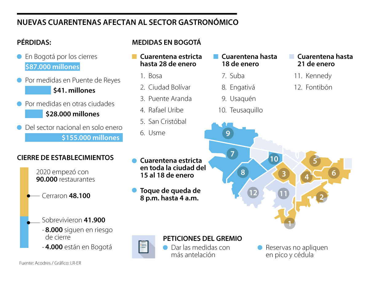 Con el anuncio de las nuevas medidas de cuarentena y toques de queda en Bogotá y otras ciudades del país, los restaurantes vuelven a prender las alarmas, pues las restricciones son un nuevo golpe a sus finanzas. De acuerdo con Acodres, en enero las pérdidas del sector gastronómico en todo el país podrían ascender a $155.000 millones.