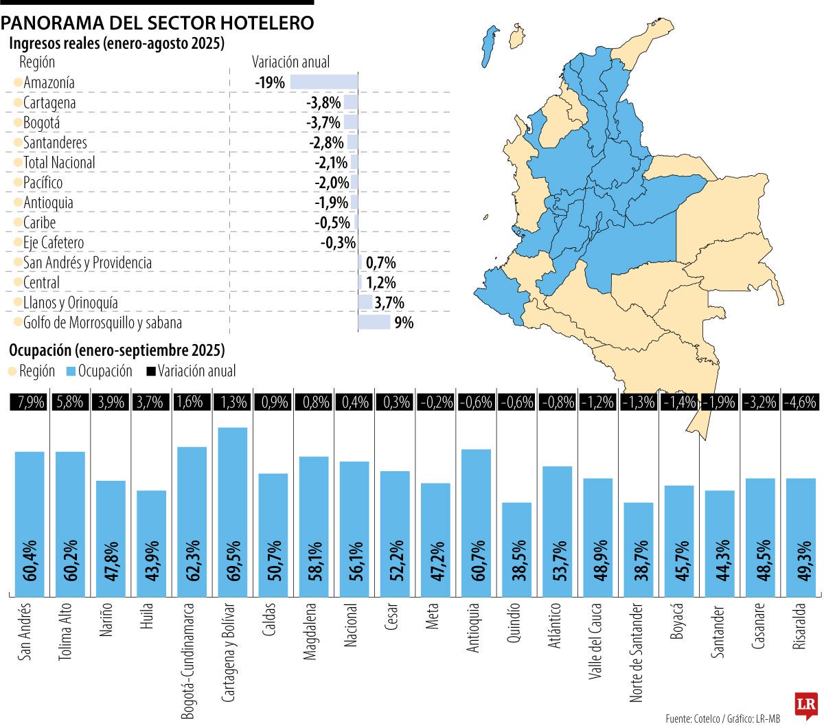 No son días fáciles los días que viven los empresarios del sector hotelero, dado que 10 de las 19 regiones monitoreadas por Cotelco registran una caída anualizada en los índices de ocupación y todas enfrentan coyunturas que le ponen presión al negocio.