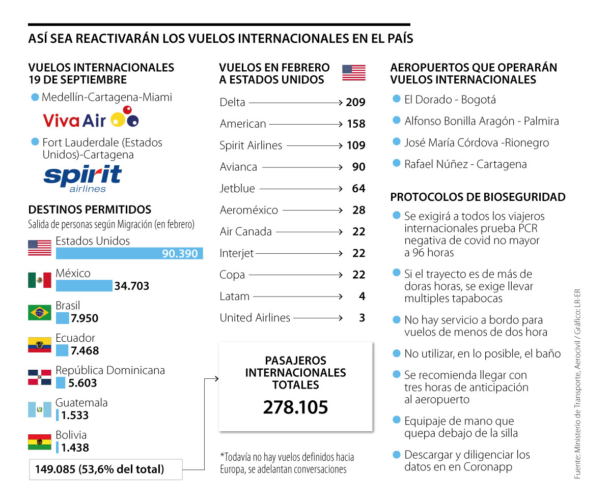 El 21 de septiembre se dará el reinicio de los vuelos internacionales en Colombia, justo 20 días después de haber empezado la actividad en el mercado doméstico. Los destinos a los que se podrá viajar son: Estados Unidos, Ecuador, México, Bolivia, Brasil, República Dominicana y Guatemala.