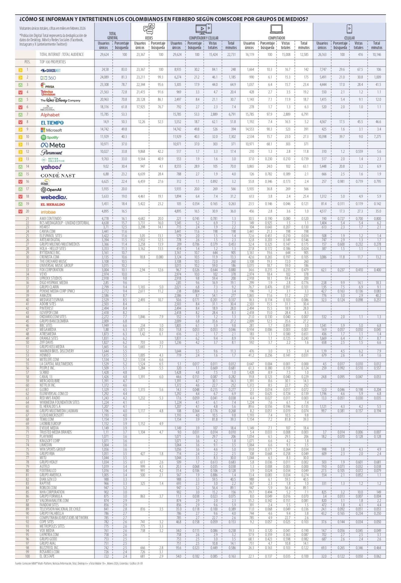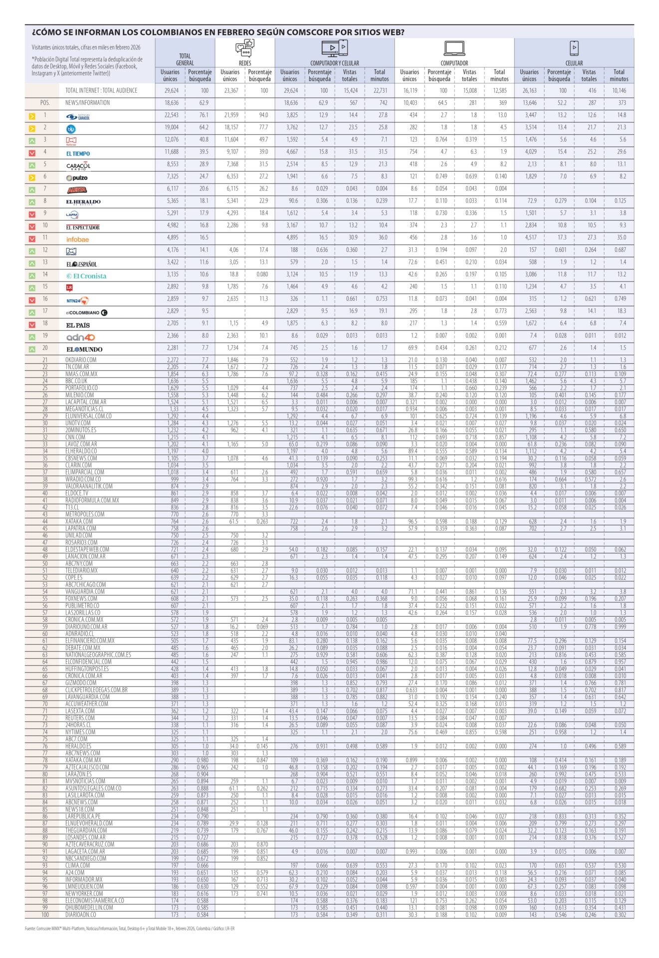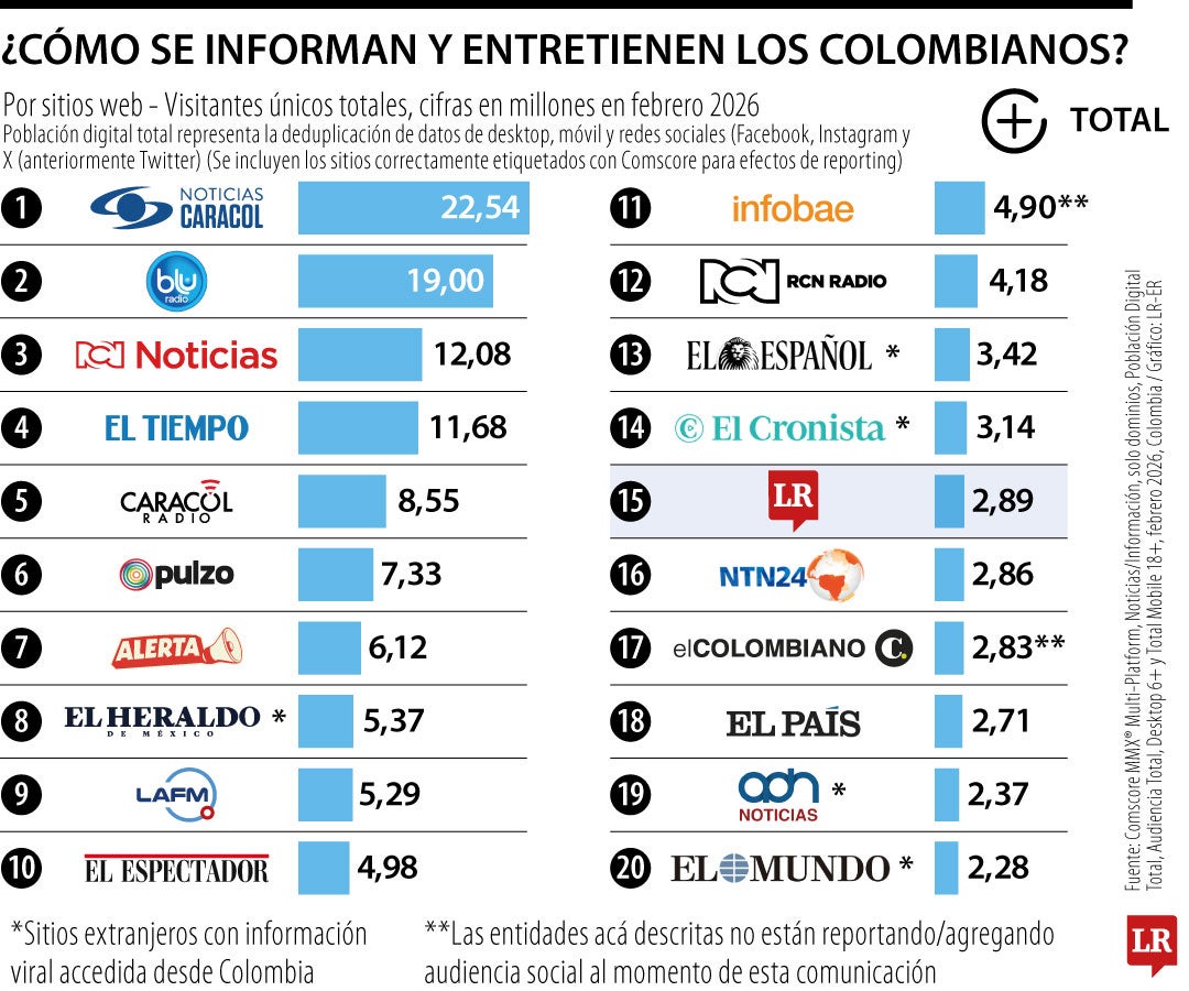 El Tiempo (11,68 millones de usuarios), Caracol Radio (8,55 millones), Pulzo (7,33 millones), Alerta (6,12 millones), El Heraldo (5,37 millones) y El Espectador (4,98 millones), continúan en el listado.