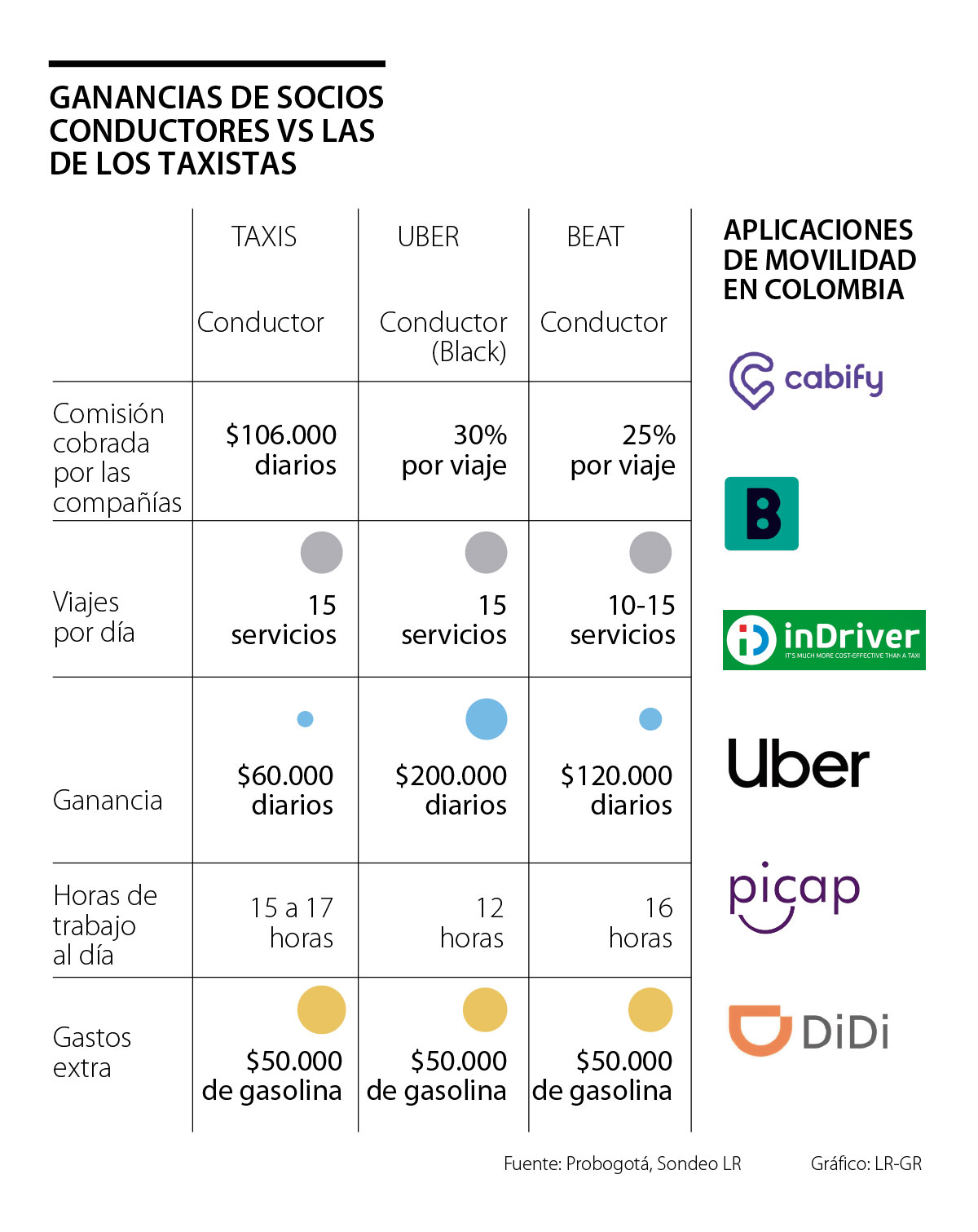 Con un promedio de 15 viajes al día, LR consultó a varios conductores para saber cuáles son los ingresos y ganancias que obtienen después de descontar comisiones y otros gastos y encontró que el conductor de taxi a pesar de ser el que más ingresa tiene con casi $220.000 al día, es el que menos ganancia tiene ya que debe pagar una cuota de entre $90.000 y $106.000 (que puede variar según quién sea dueño del carro), y tanquea con cerca de $50.000 por lo que solo le quedan $60.000 de ganancias.