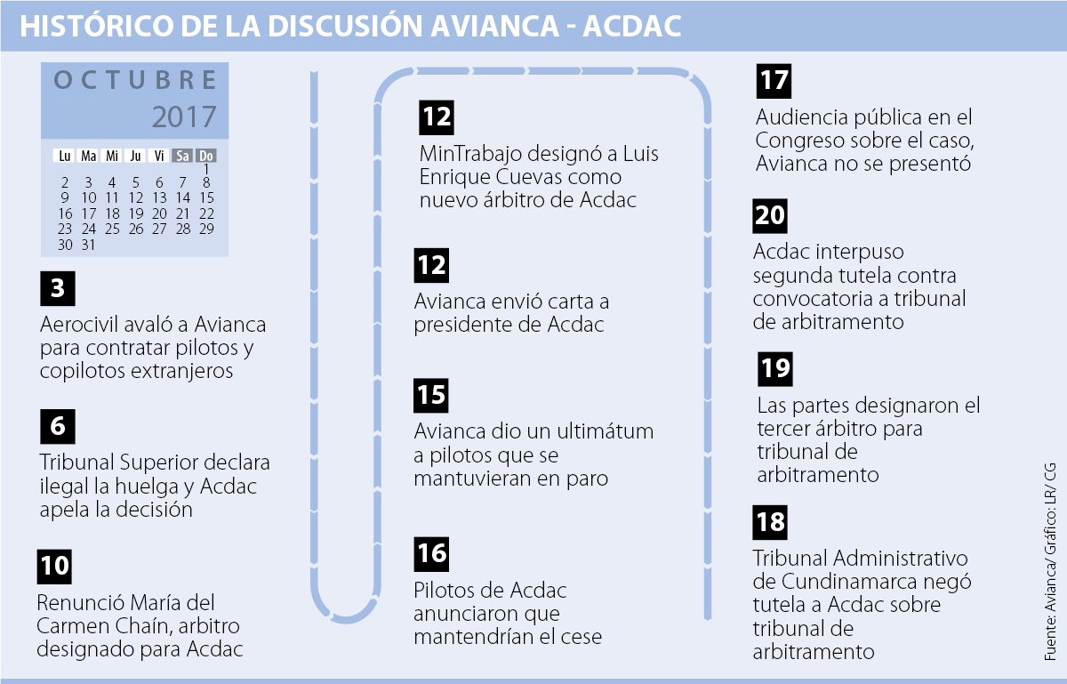 Con la designación del tercer representante para el tribunal de arbitramento y la segunda acción de tutela que interpuso Acdac contra esa misma convocatoria, esta semana se cumplió un mes desde que los pilotos afiliados a Acdac iniciaron el cese de actividades.
