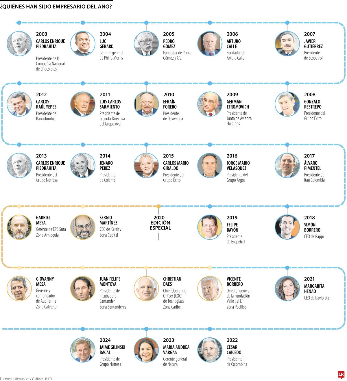 Pero, ¿quiénes tuvieron este reconocimiento en las versiones anteriores? Los últimos 13 empresarios destacados fueron Jaime Gilinski, presidente de Nutresa (2024); María Andrea Vargas, gerente general de Natura (2023); César Caicedo, presidente de Colombina (2022); Margarita Henao, presidenta de Daviplata (2021); Felipe Bayón, presidente de Ecopetrol (2019); Simón Borrero, CEO de Rappi (2018) y Álvaro Pimentel, presidente de Itaú Colombia (2017).
