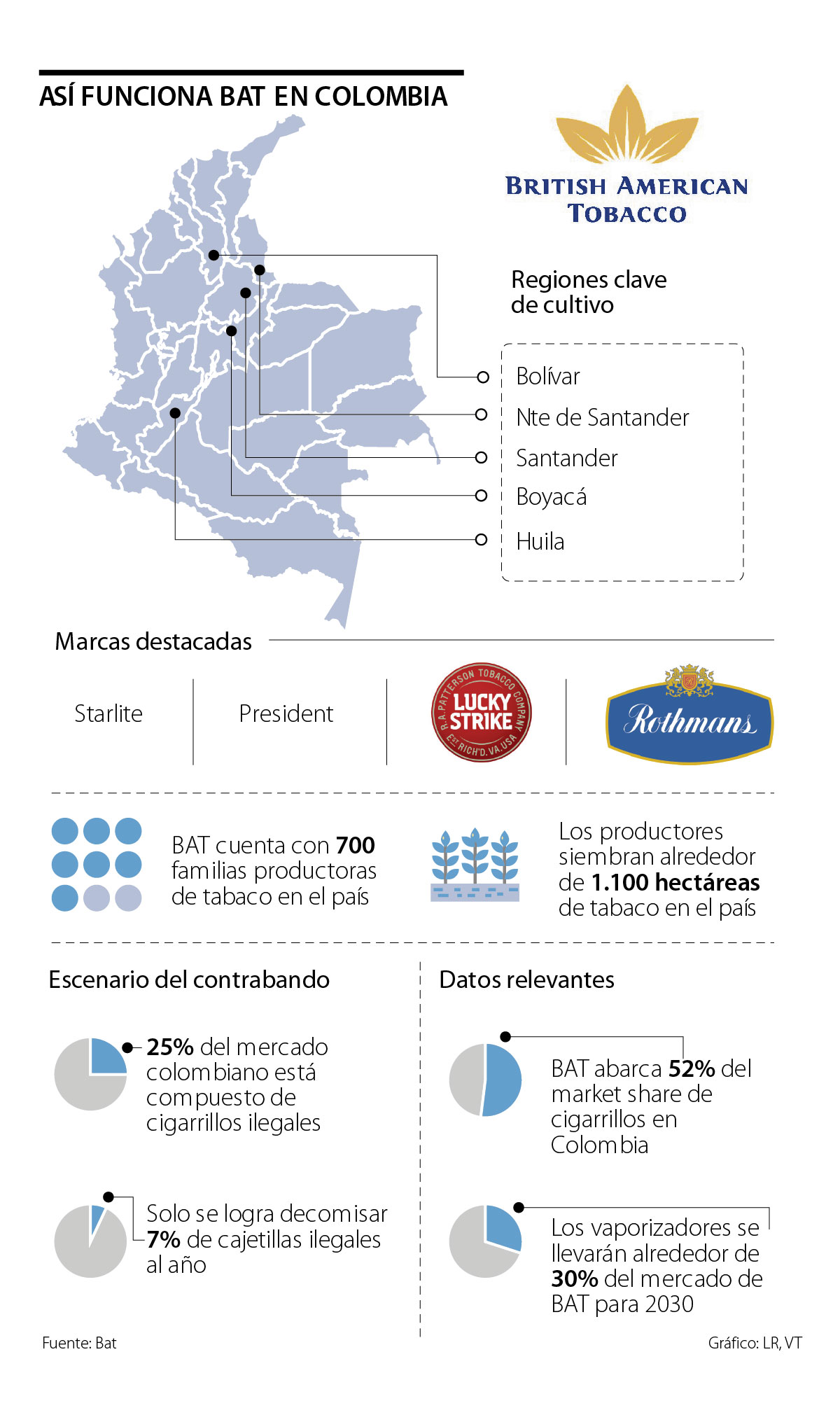 Cabe destacar que, luego de que Philip Morris International (PMI) anunció que dejaría de comprar tabaco en el país para 2020, BAT se convertirá en la única gran tabacalera en adquirir el producto localmente. Hoy en día, contrata con 700 familias productoras que siembran alrededor de 1.100 hectáreas en zonas como Bolívar y Huila.