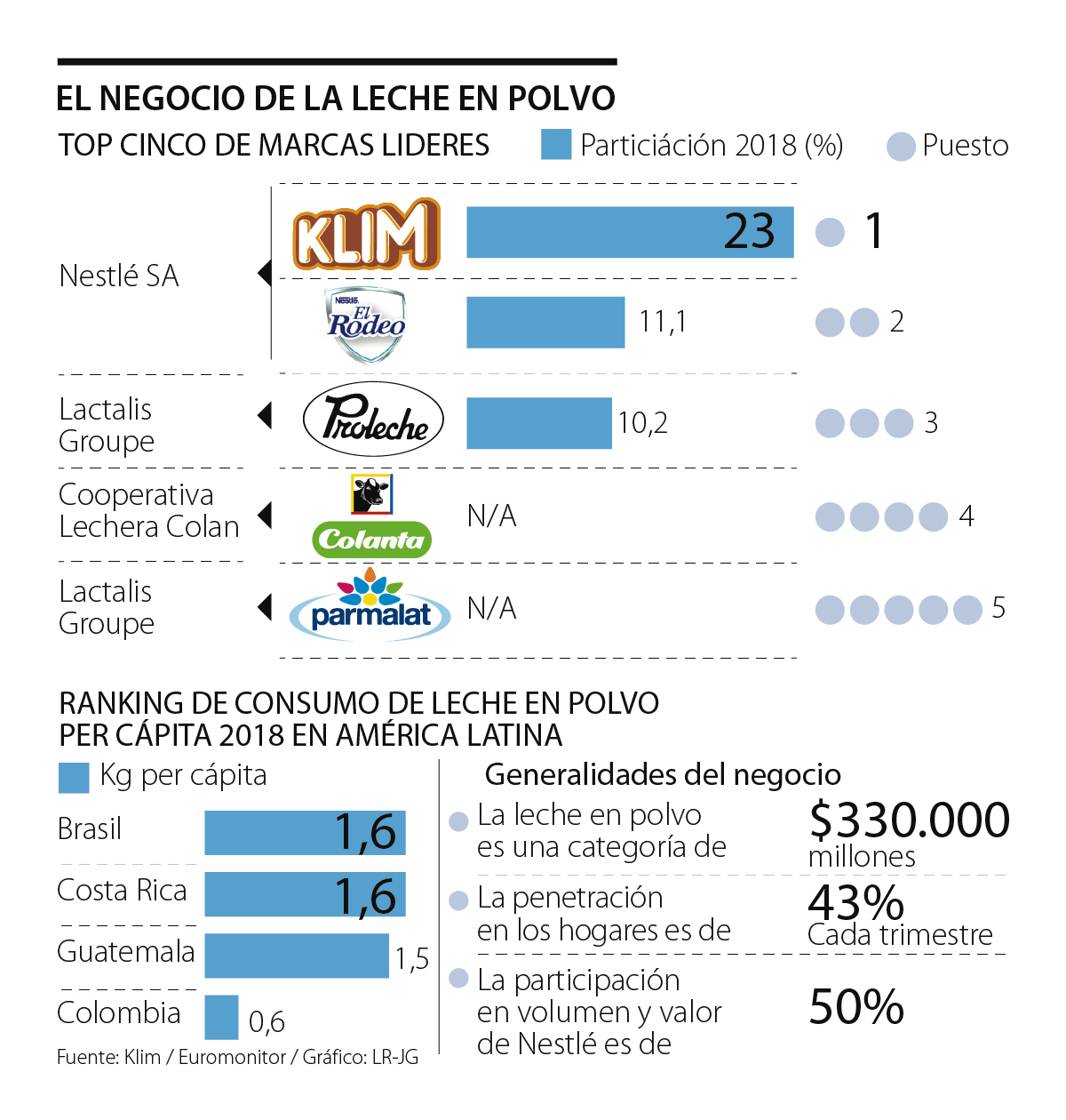 Vale la pena destacar que según Arbeláez, de dicha participación, las dos marcas de Nestlé (Klim y El Rodeo) se llevan casi 50% del negocio; tanto en términos de valor como en ventas.