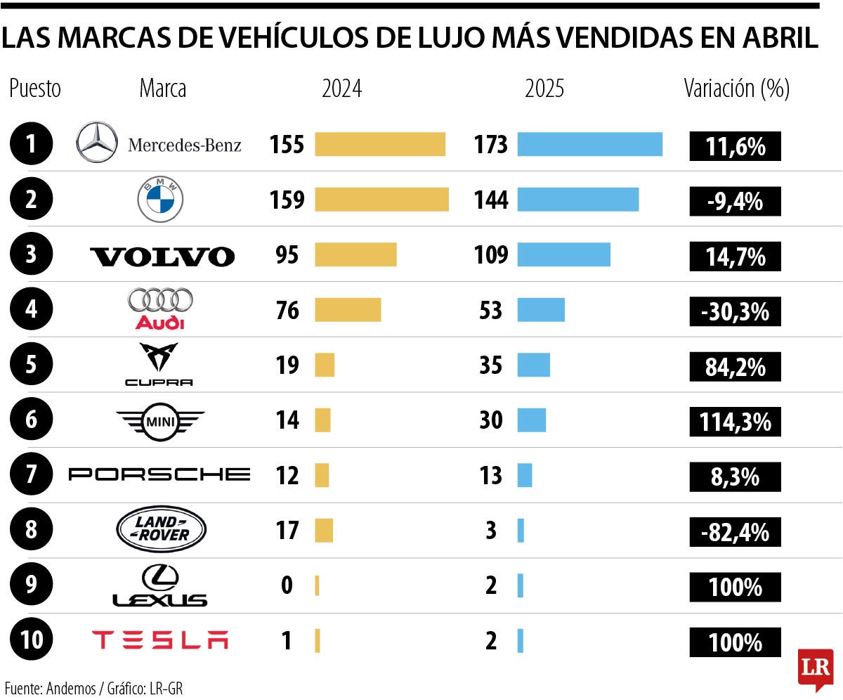 Le siguió BMW, que perdió el liderato tras registrar 144 vehículos vendidos en el mes, retrocedió 9,4% frente a abril de 2024. El tercer lugar lo obtuvo Volvo con 109 matrículas, un crecimiento de 14,7%. El top5 de las marcas de lujo con más ventas lo complementan Audi (53) y Cupra (35).