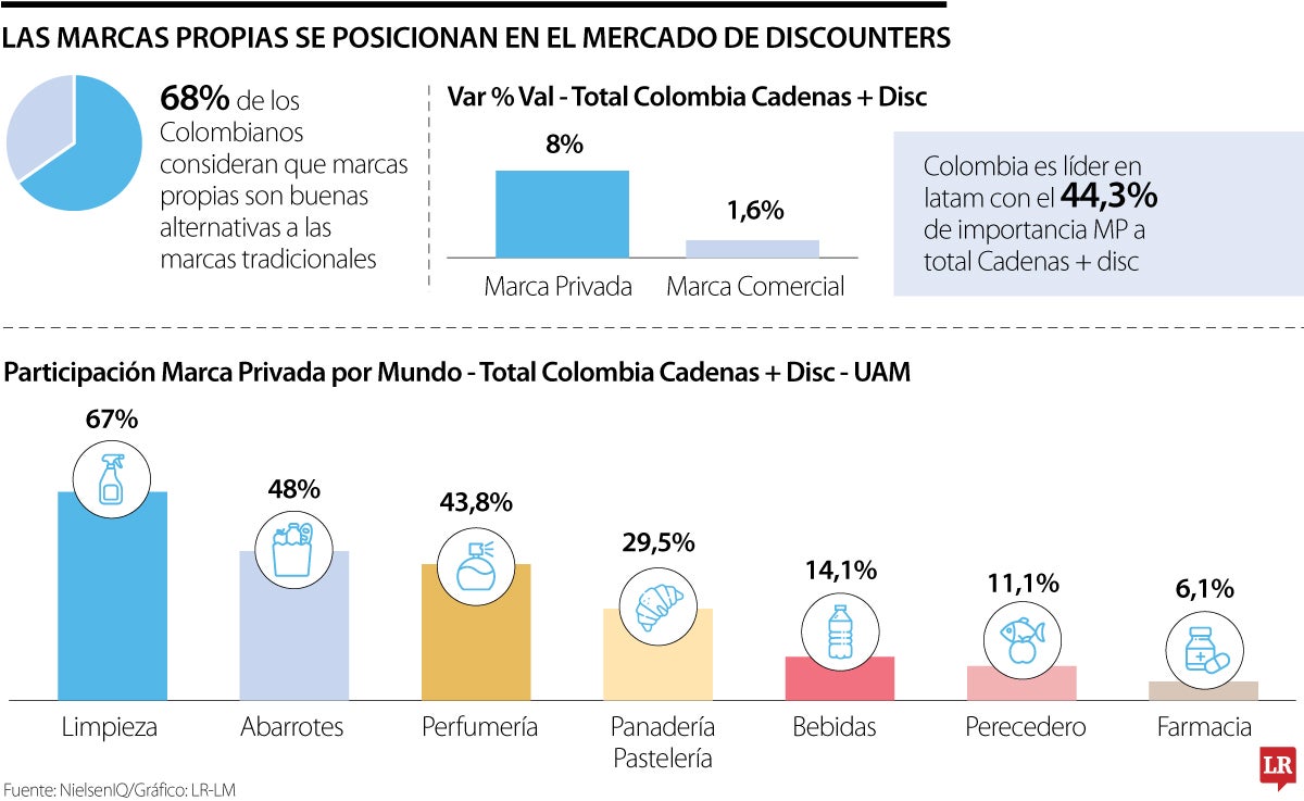 Si se tiene en cuenta todo el mercado en Latinoamérica, Colombia es líder en este segmento, ya que las marcas propias representan 44,3% en todas las ventas en cadenas y discounters.