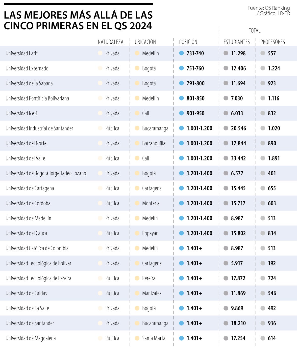 La Universidad de los Andes y la Nacional lideran en el ranking QS por su buen desempeño, sin embargo, hay otras 20 instituciones, más allá del top cinco, que resaltan en el listado revelado la semana pasada. Si se mira su composición, en total hay 12 instituciones privadas y ocho públicas. De estas, cinco están ubicadas en Bogotá, tres en Medellín, dos en Cali, dos en Bucaramanga, dos en Cartagena, y el resto en ciudades como Montería, Barranquilla, Pereira, Manizales, Popayán y Santa Marta. Las instituciones están entre la posición 731 hasta la 1.401.