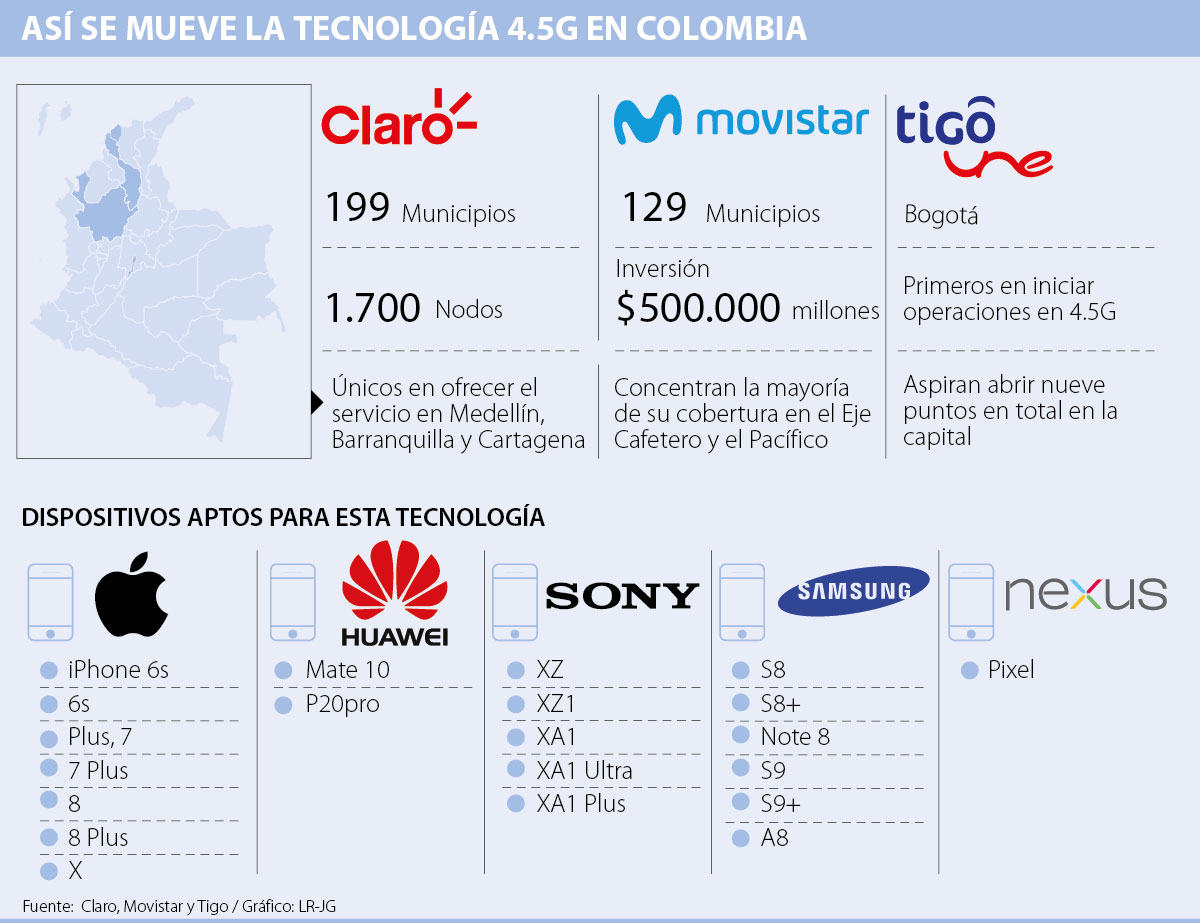 El primer operador en oficializar el tema en Colombia fue TigoUne, entidad que puso en Bogotá su foco de atención para ser los primeros en lanzar la tecnología 4.5G. La compañía, dirigida por Marcelo Cataldo, estableció dos zonas de esta tecnología en la capital: una en el Parque de la 93 y la otra en Centro Mayor.