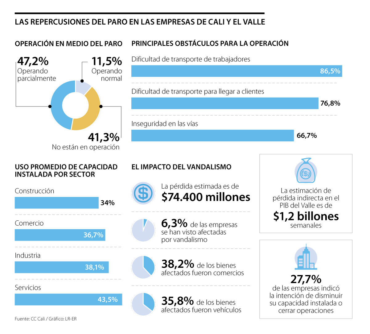 El Paro Nacional iniciado el pasado 28 de abril ha tenido especial intensidad en el Valle del Cauca, en donde la situación de orden público se ha agravado y ha dejado enfrentamientos armados entre la sociedad. Además, establecimientos de comercio han sufrido saqueos y ataques contra sus instalaciones, lo que ha generado pérdidas millonarias y podría hacer que 7,7% de empresas cierren definitivamente.