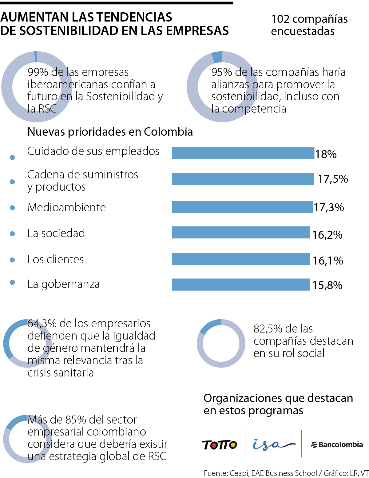 Precisamente, una encuesta realizada por EAE Business School, en colaboración con Ceapi a 102 organizaciones de Iberoamérica, evidenció que más de 85% del sector empresarial colombiano considera que debería existir una estrategia global de RSC; y 64,3% defiende aspectos como la igualdad de género tras la crisis sanitaria.