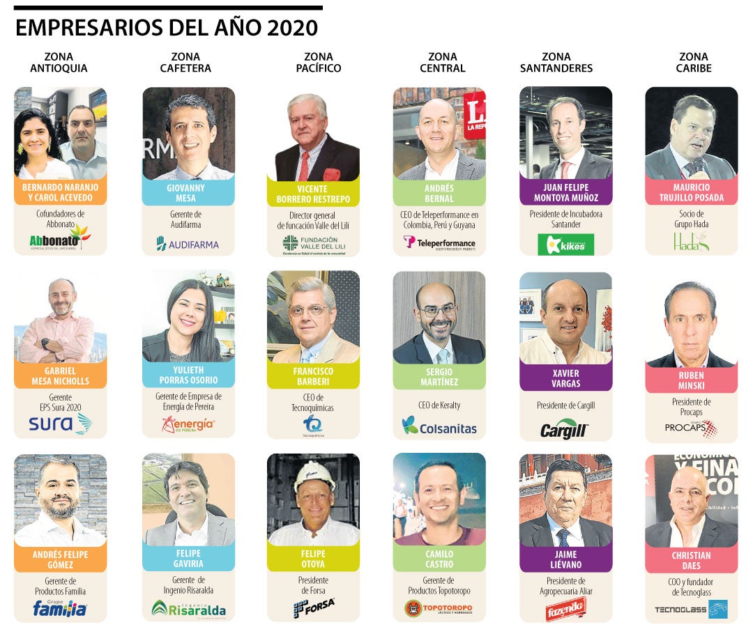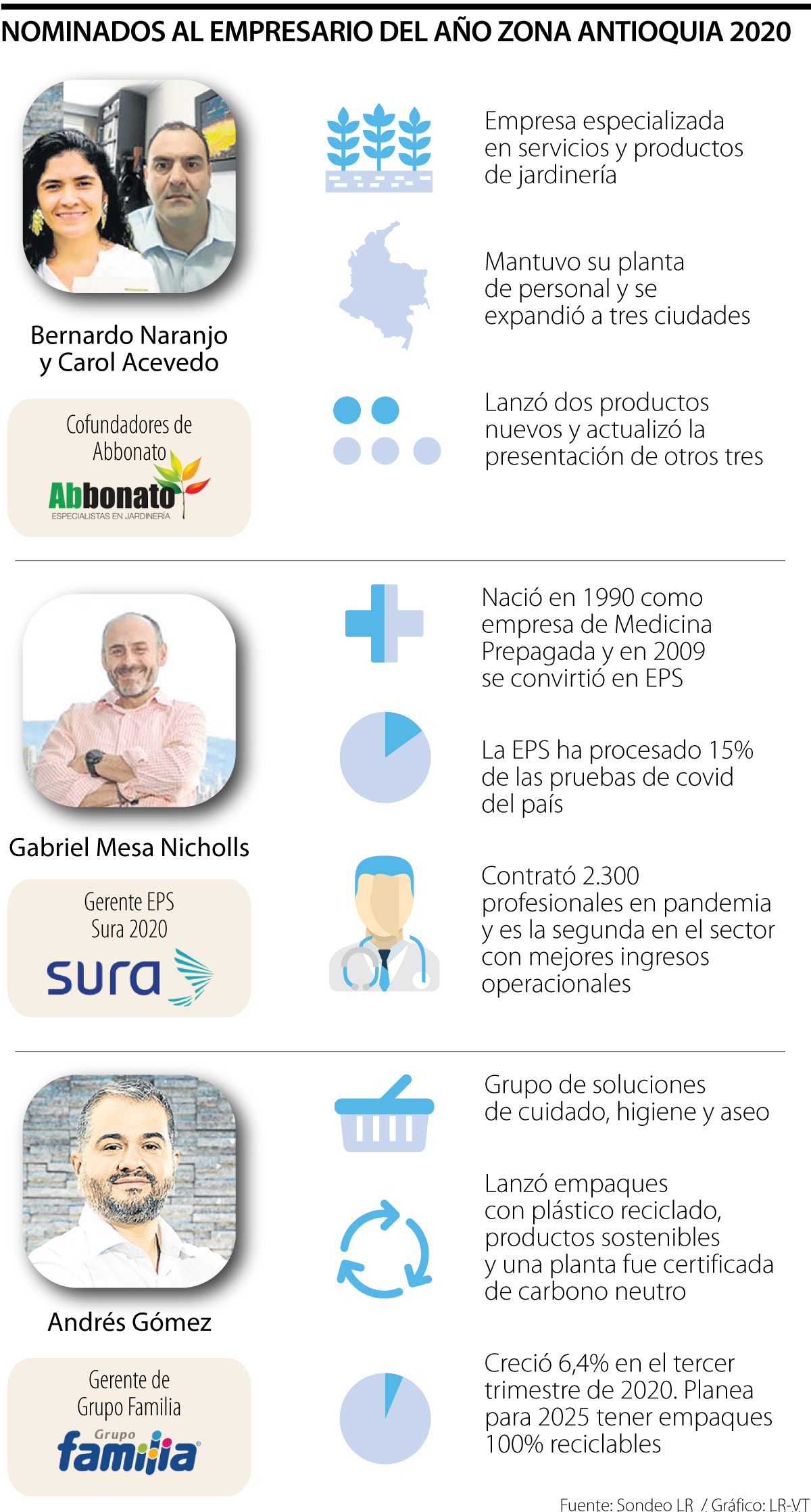Para este caso, los nominados por la Zona Antioquia son Bernardo Naranjo y Carol Acevedo, cofundadores de Abbonato; Gabriel Mesa Nicholls, quien fue gerente de EPS Sura en 2020, cargo que desde enero ocupa Pablo Otero; y Andrés Felipe Gómez, gerente de Grupo Familia.