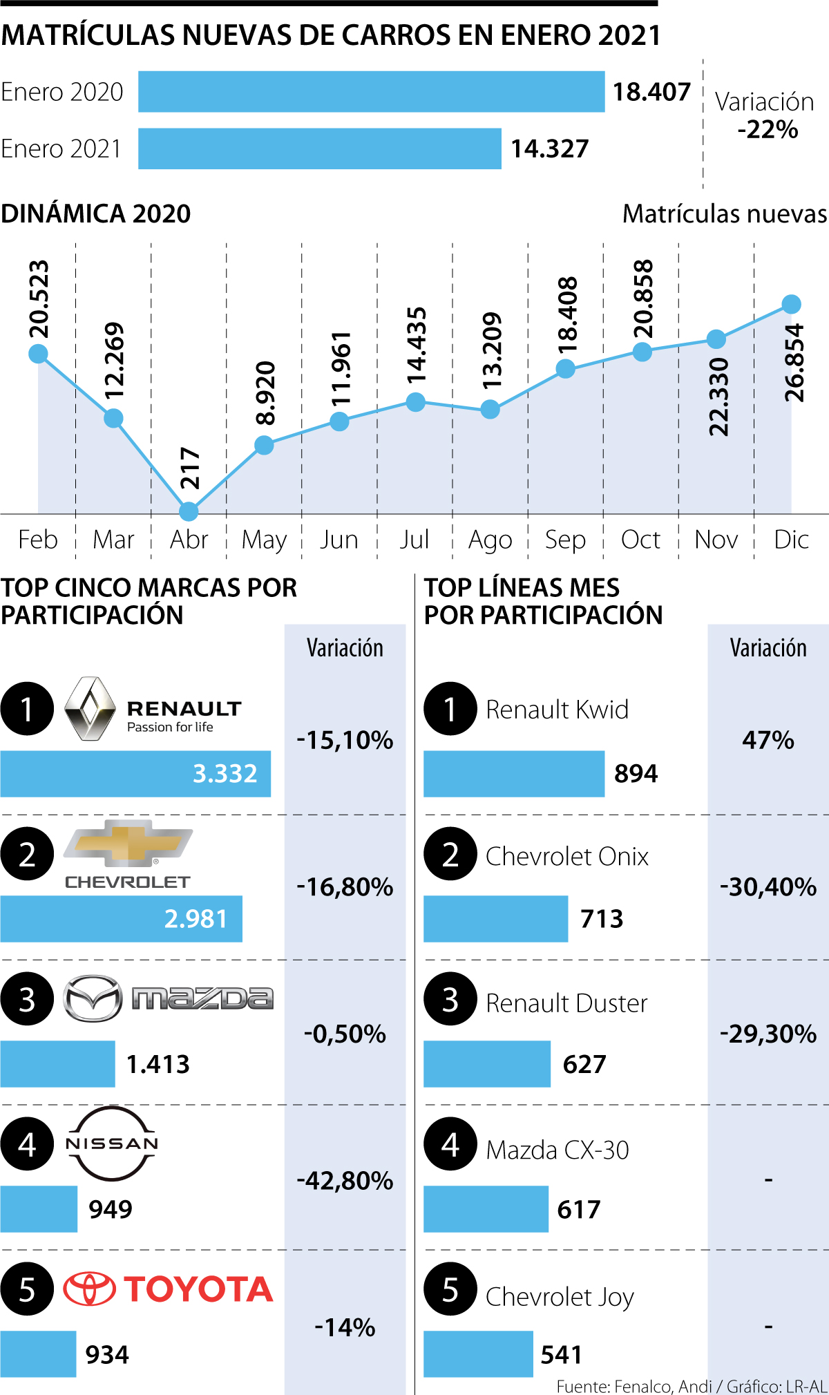 De acuerdo con los dos informes que presenta el sector automotor nacional, uno de la Andi y Fenalco, y otro de Andemos, las matrículas de vehículos nuevos en enero tuvieron una caída de 22%, pues se comercializaron 14.327 unidades, mientras que en el primer mes de 2020 fueron 18.407.