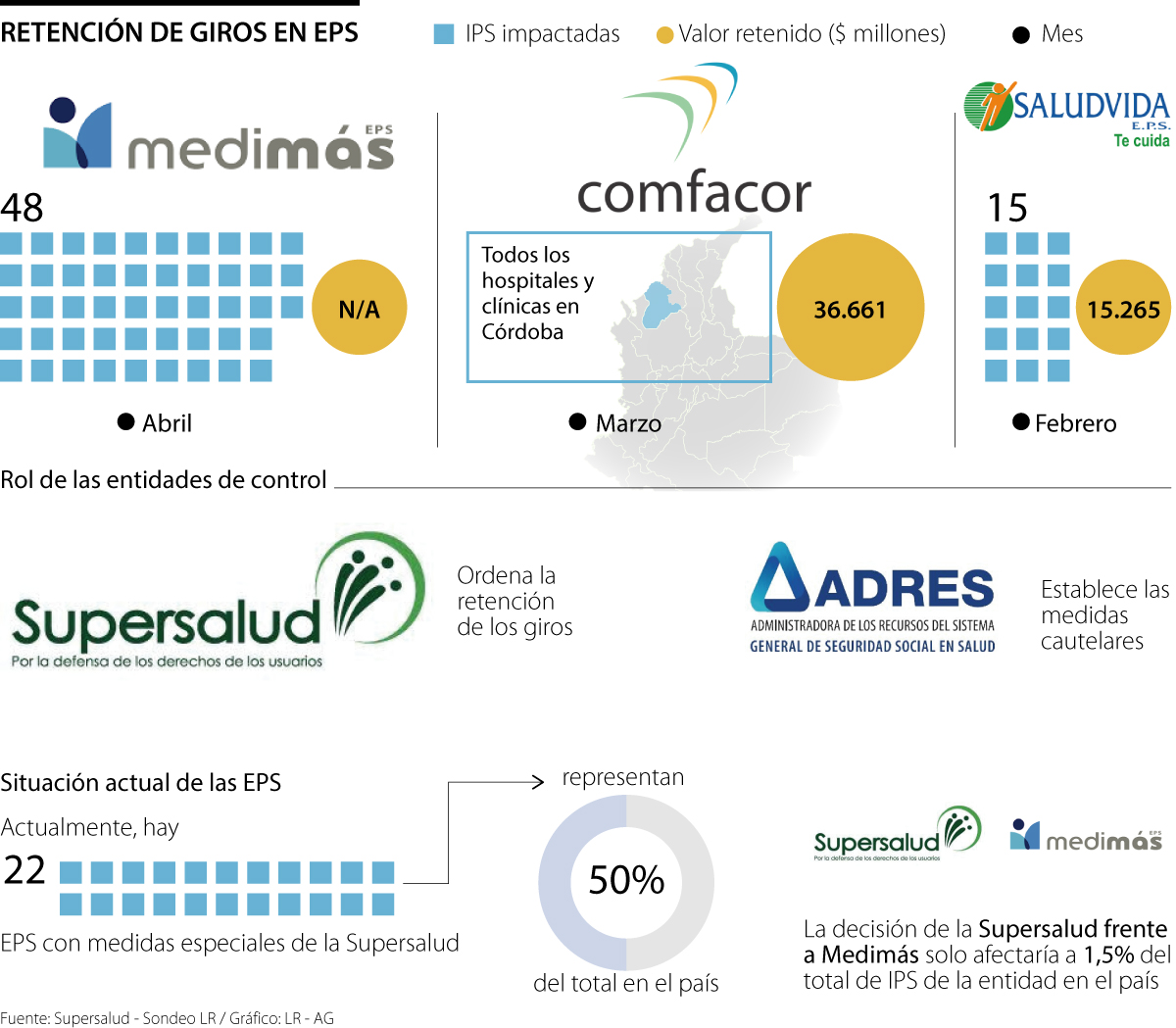 Según explicó la Administradora de los Recursos del Sistema General de Seguridad Social en Salud (Adres) a LR, la sanción a Medimás no involucra la suspensión de pagos como tal, sino que está relacionada con la autorización de los giros. En este caso, la EPS debe administrar los recursos a otras IPS diferentes a las 48 incluidas en la investigación de la Supersalud, con el propósito de evitar riesgos de favorecimiento a entidades vinculadas.