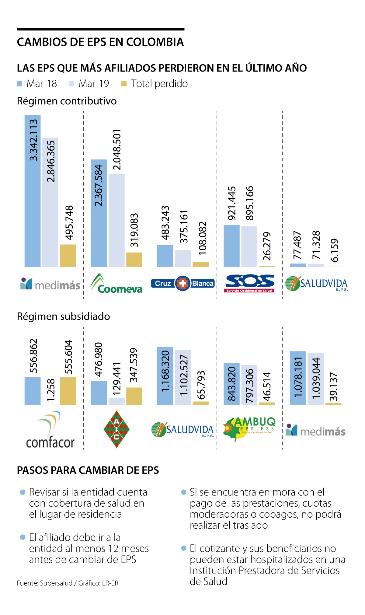 Sin embargo, esta no es la única EPS que ha registrado pérdidas. En el régimen contributivo le siguen Coomeva con 319.083 usuarios, Cruz Blanca con 108.082, Servicio Occidental de Salud (SOS) con 26.279 y Saludvida con 6.159 (Ver gráfico).