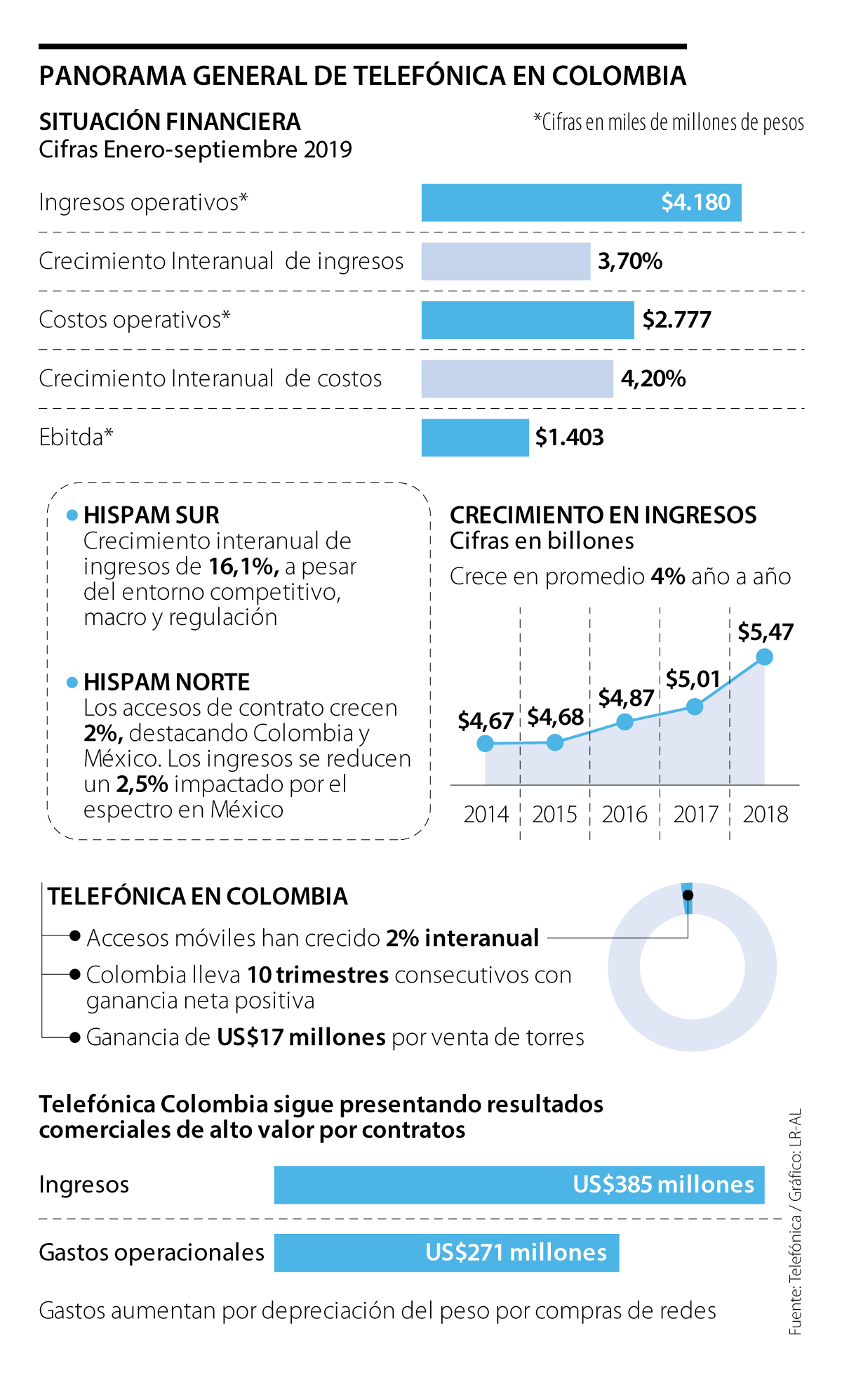 Según los reportes financieros de Telefónica Colombia la operación local solo viene creciendo en promedio a 4% año a año y en lo que va de 2019 los ingresos de la compañía se ubicaron en US$1.100 millones jalonados principalmente por los ingresos de voz fija, de fibras y venta de terminales.