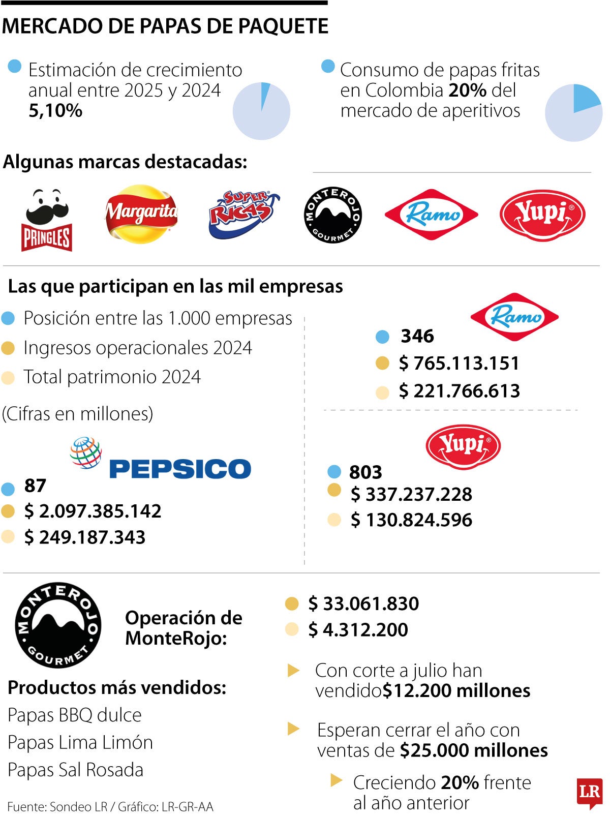 A estas se suma otra creada de forma más reciente, y la cual ha logrado gran crecimiento por su diferencial, como es el caso de MonteRojo, al ofrecer sabores alternativos. De hecho, sus productos más vendidos son las papas BBQ dulce, lima limón y sal rosada.